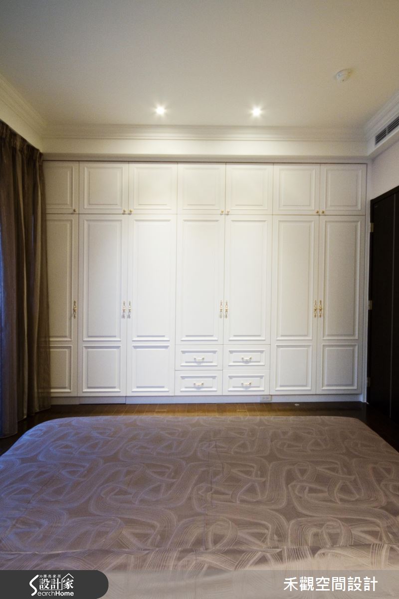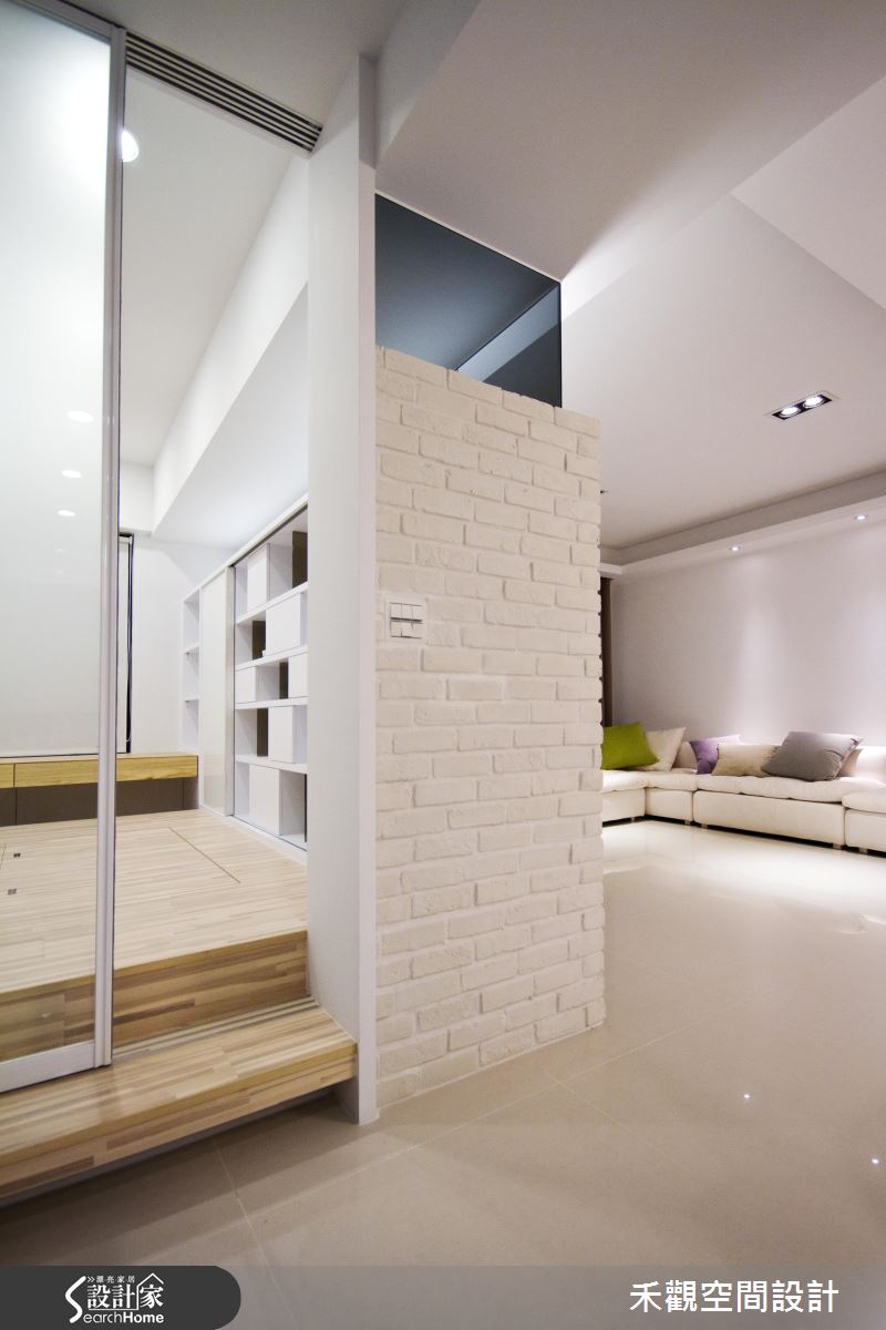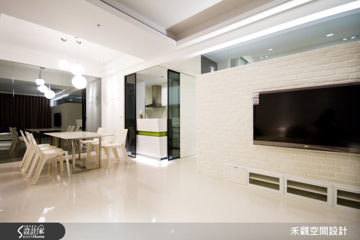 從門口進入,玄關側安排整面櫃體,白色烤漆光澤搭配燈光,更加凸顯精緻質感。深處則設置直紋玻璃屏風,利用清透介質劃分領域界線,同時也讓空間更顯輕盈。公共領域納入客廳和餐廳,電視牆以文化石堆砌溫潤質樸的感受,局部採用玻璃營造穿透性,進而連結後方的多功能空間。餐廳和廚房以黑玻拉門區隔烹飪時產生的油煙,同時不影響通透感。設計師特別在餐桌旁安排充足的收納櫃,外部使用鏡面門片,除了隱藏雜物,透過鏡面的反映效果,將餐廳空間延展再放大!臥室也富有豐富的收納機能,並綴入線板細節,呈現細緻的高級質感。