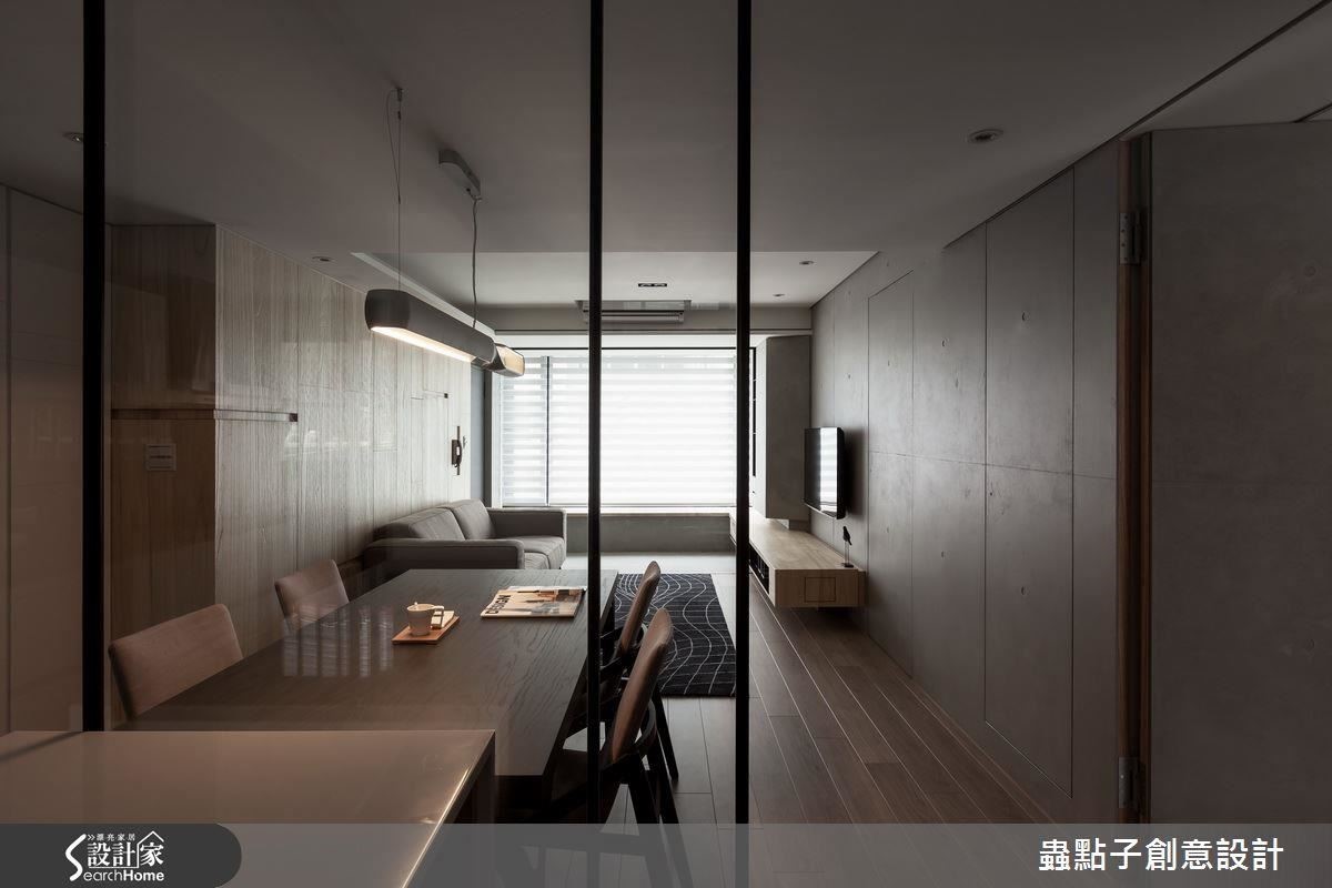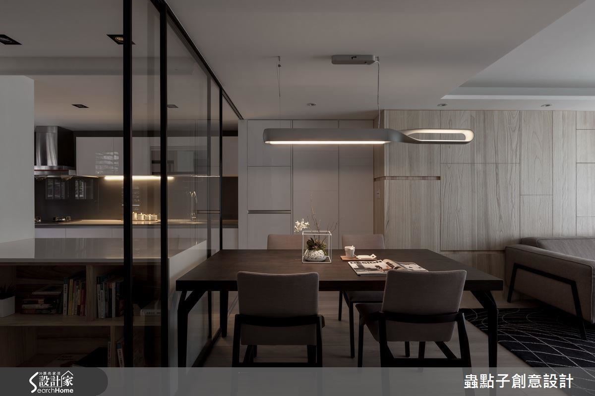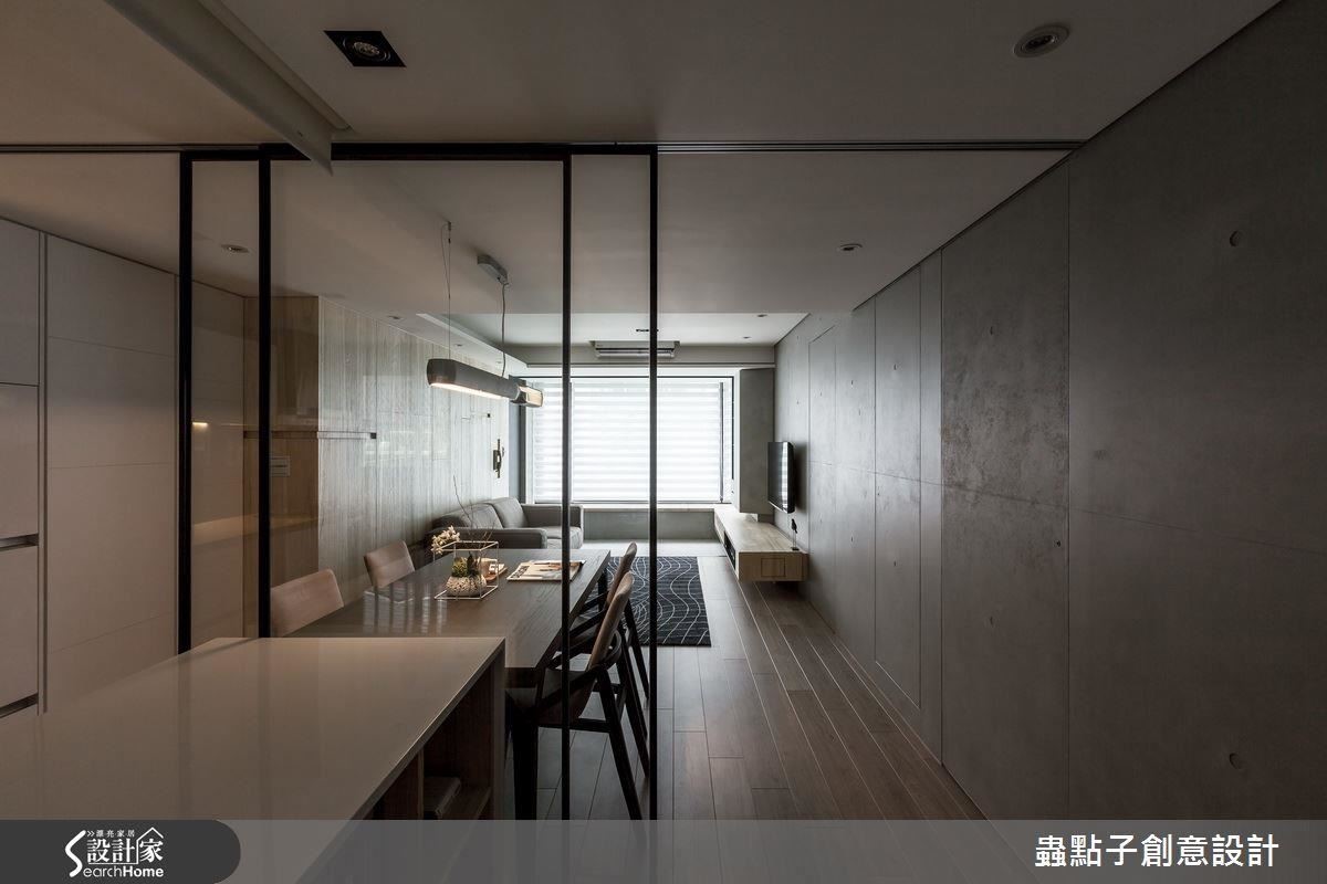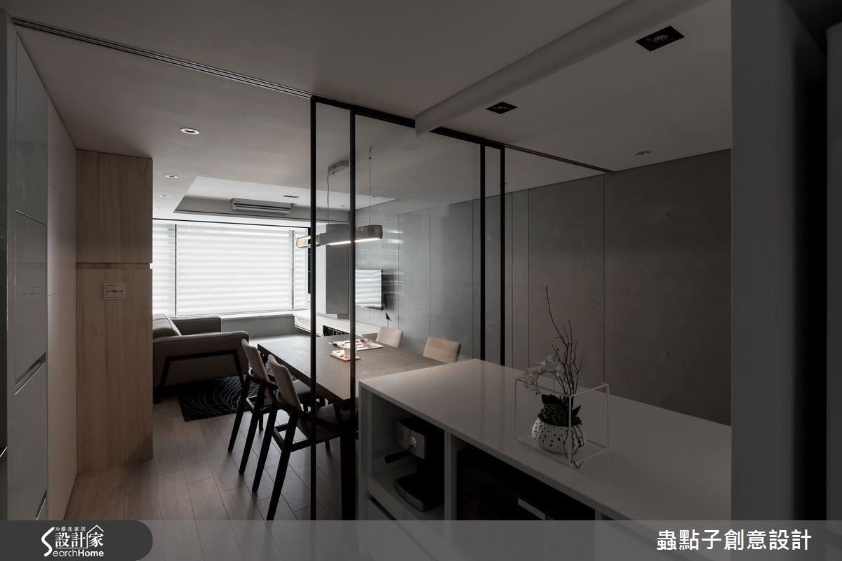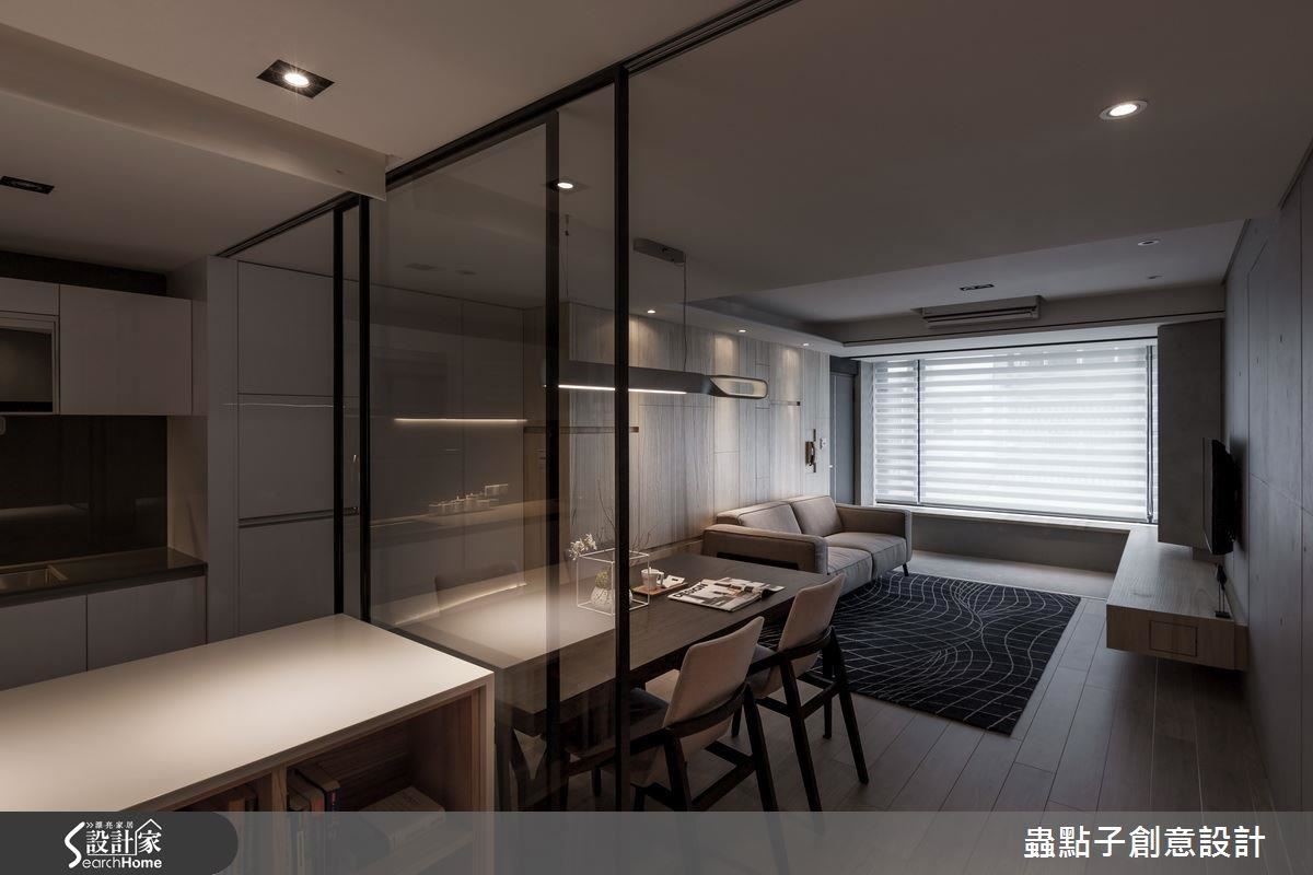 雖然室內坪數僅 25 坪,但考量屋子現階段僅需服務個人,許多空間大可重疊使用,特別是呈一軸線、數個彼此環環相扣的機能單元,靈活組成一處開放感十足的公領域,而鄭明輝設計師針對此案最重要的巧思之一,就是以幾乎沒有存在感的鐵件玻璃拉門、隱藏於天花板內的升降式捲簾,作為客廳、餐廳、廚房與書房之間共用的彈性介質,一方面可以提煉出屋主喜歡的人文咖啡館情調,一方面打造兼具實務效益的工作檯兼中島,那麼無論屋主在某個時間點,對空間有何種期待,就都能加以滿足囉!