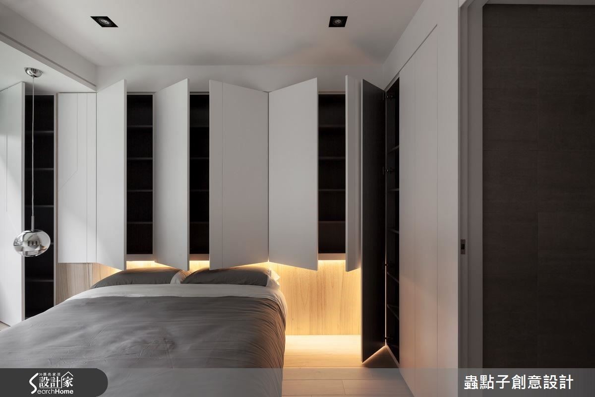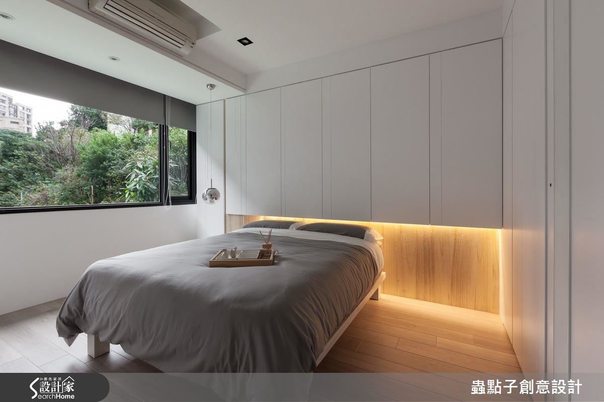 主臥室質地清爽,延續白色搭配淺木色的現代、親自然路線,這也是屋主非常喜愛的風格主題,設計師並善用床頭樑下深度增設收納空間,一色純白的量體,看起來完全不佔空間,上櫃下緣並加裝柔和照明,平添休憩時的浪漫。
