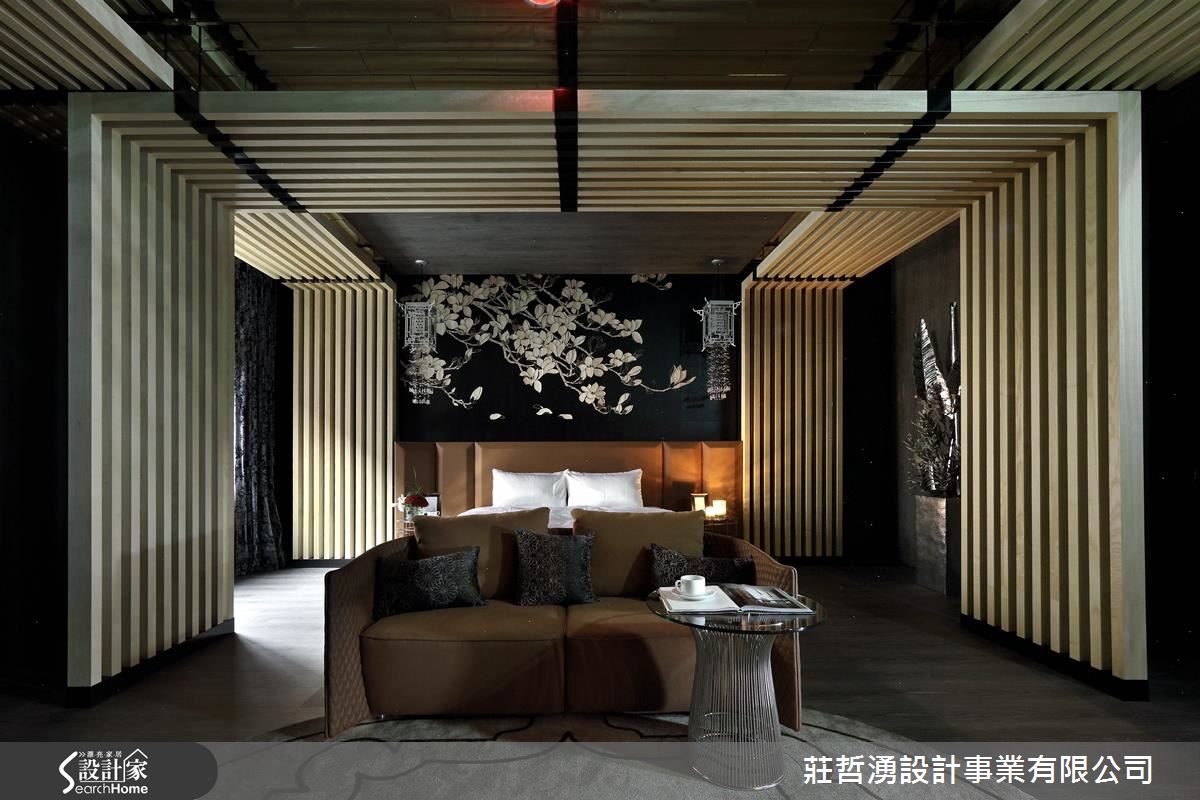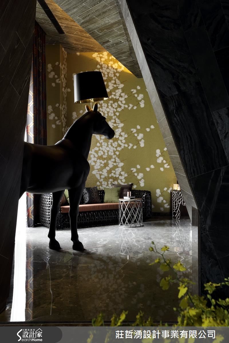 房型「鑿室」,仿造岩洞概念,把立面延續至天花,透過削切手法予以大面積覆蓋,表材透過不規則山紋的木皮堆疊,增加視覺溫度與立體度,通往浴室動線亦模仿岩洞開口,以三角洞口進行視覺壓縮,後續造就柳暗花明的釋放感受,並於浴室加入帶有自然紋理的面材,透過光影與岩壁的雕琢,建構成沐浴於自然山壁內的想像,後續則可再次穿越岩洞來到睡眠區,以壁紙模仿花落與綠景,陳設駿馬藝術品增添空間亮點,讓人彷彿安然入睡於曠野之中。