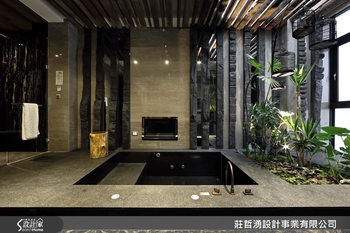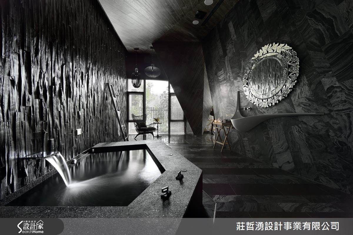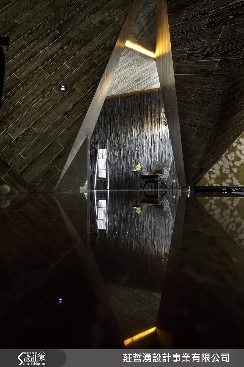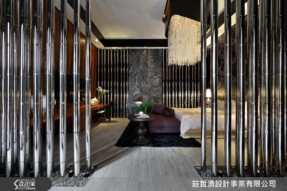 「鐵竹林」,則參考「長城腳下的公社」之「竹屋」概念,利用金屬打造竹枝意象,用以裁切與圍塑場域,在明確界定空間的同時,同時保有視覺穿透之美,並於牆面選用充滿金屬紋理的黑色石材鋪述,以黑襯托銀白金屬,相互輝映時尚氛圍,且巧妙裝飾飛入竹林的白鐵蝴蝶,創造生動情境,延伸進入浴室後,則可見自然石皮表現的岩洞氣勢,彰顯自然渾厚的力量。