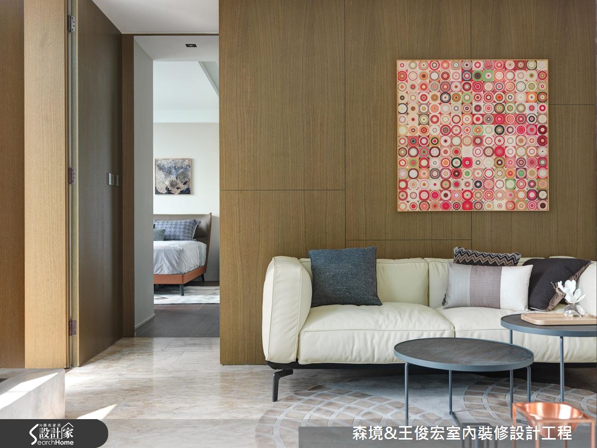 除了俐落的現代語彙,森境團隊也不忘運用材質特性,增添家的暖度。客廳區一路鋪陳的木地板以及通往臥房起居室立面的暖色調木質主牆,透露出家的溫馨。