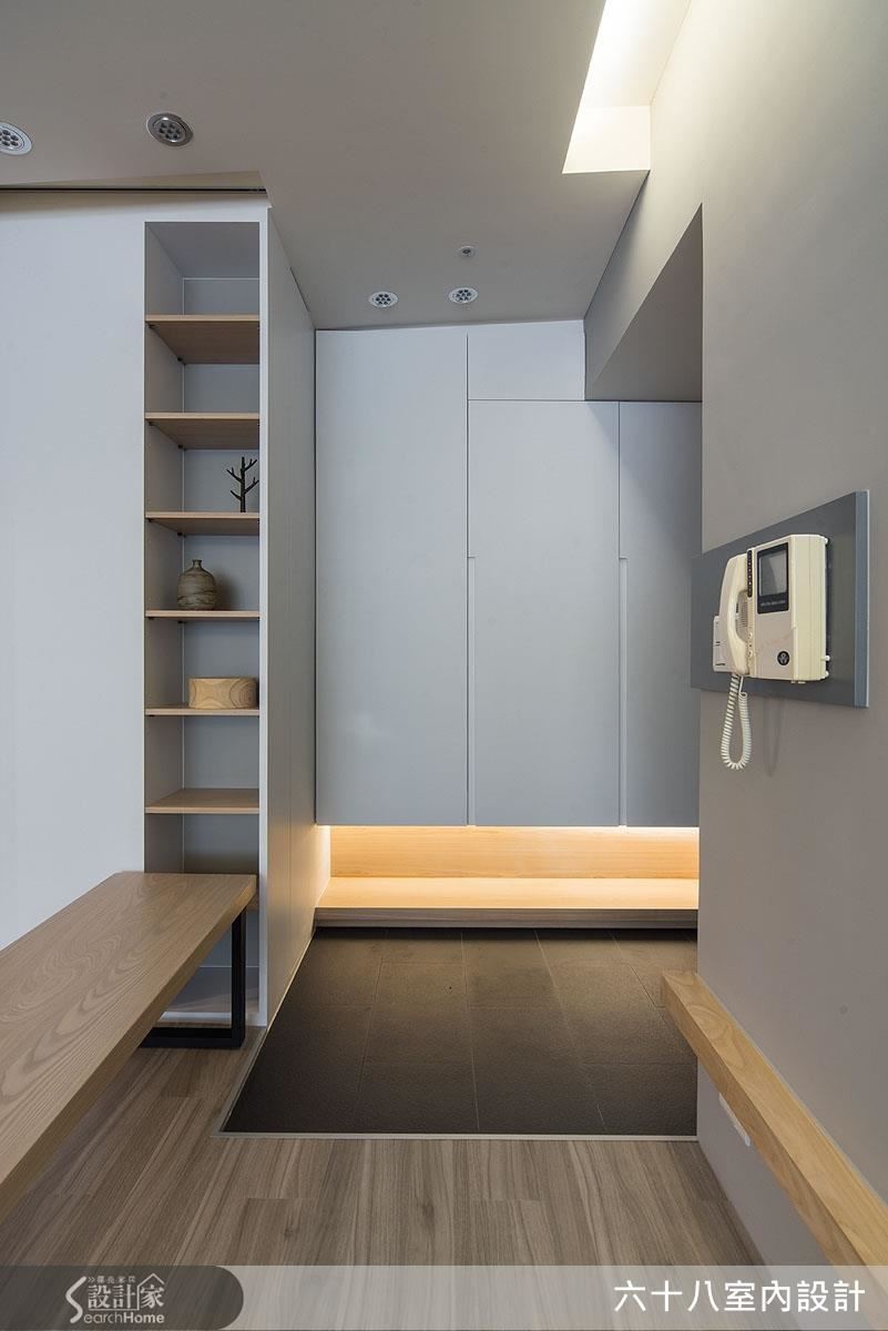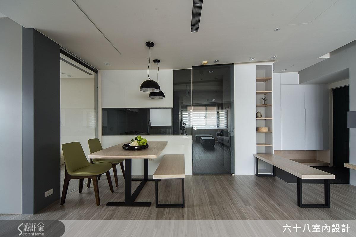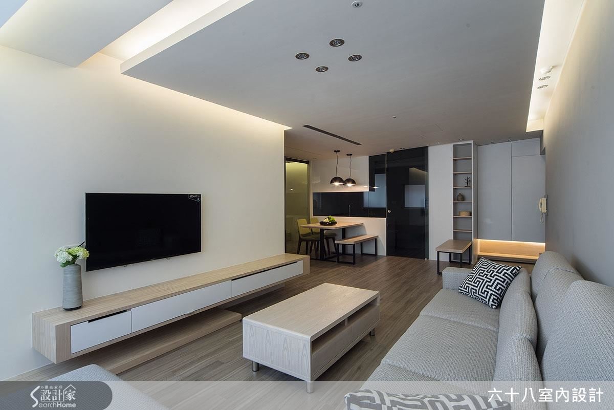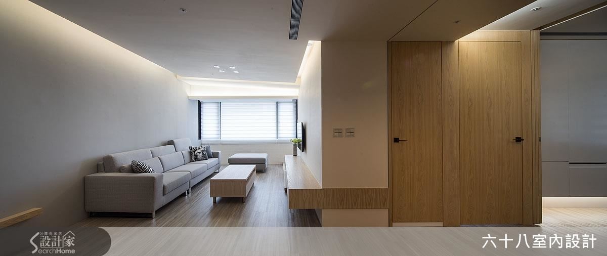 從玄關開始,以牆面櫃體建構導引動線,藉由底部懸空與燈光照明設計,造就輕盈立體的入門觀感,轉折之後,則刻意鋪排長型穿鞋椅,於牆面作出線性造型,順勢引領來到公共領域;客餐廳則呈開放設計,以寬敞的空間格局、搭配多面向的採光照進,讓人身處其中備感明亮開朗,沙發選用灰色調呼應牆面色彩,並引用淺色木質作出中介調和,讓中性色調貫徹乾淨簡練的主題。電視牆給予長型的視聽櫃延伸,經由巧妙的轉彎,帶入至私領域的門片開口,自然而然地構築出流暢的生活脈絡;廚房、餐廳之間植入了深色玻璃材質,保有錯落隱約的視覺層次,圍塑出靜謐不受干擾的通透視野,並加入稍有斜度的天花板設計,帶出俐落的線條變化性;主臥天花延續了不規則的切割線性,型塑有如剪裁的意象,並運用木質調與淺白色系的揉合,闡述簡單自然的態度!