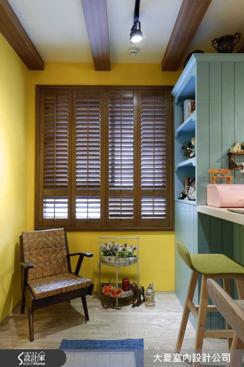 利用明亮清爽的檸檬黃做為公領域的主色調,接著以紅磚質地的文化石與木樑提出經典的鄉村風元素,佐以仿舊家具配件,營造粗獷、自然的道地氛圍。開放式餐廚空間為本案一大亮點,因應單純人口,設計師以吧台取代餐桌,抹除制式用餐動線。巧妙以復古磚區隔開放式客、餐廳的界線,接著以水藍色塗刷一字型廚房的櫃面與吧台壁板,並在牆面拼貼花磚,構成甜美簡約的鄉村廚房。設計師更在木百葉窗邊預留一張單人椅,打造光感十足的獨享空間。