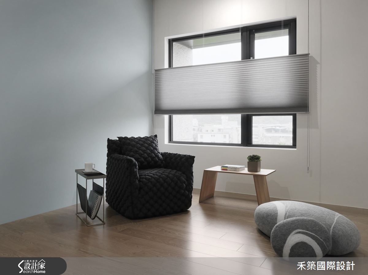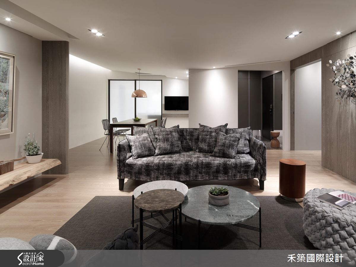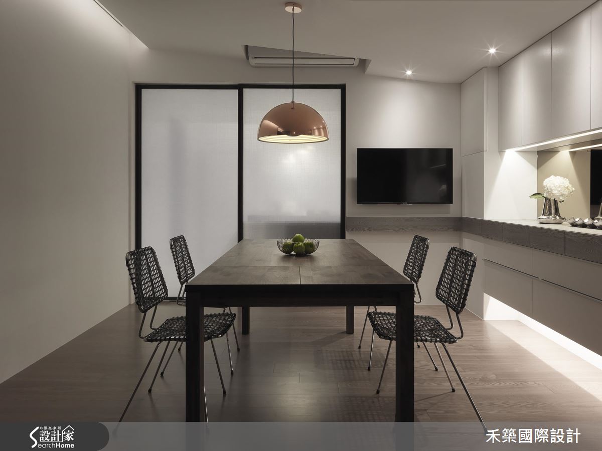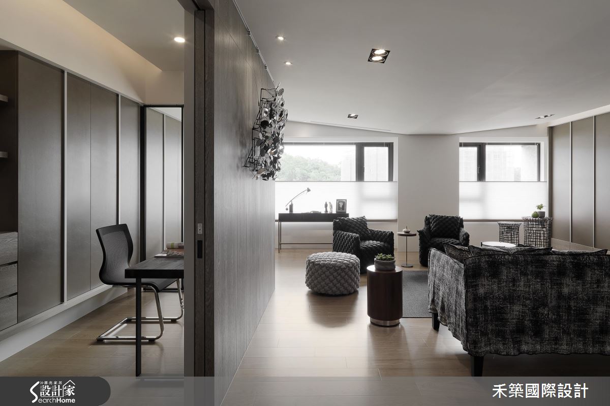 玄關規劃展示收納櫃體,配置一道鐵件玻璃拉門,連通至客廳,做出適度的場域區劃;廳區利用天花降板包覆大樑、削弱視覺壓迫,且做出些微傾斜角度、型塑線條層次,客廳則呈開放格局配置,家具給予靈活環狀陳列,隨時可因應不同需求調整位置,並打破制式電視牆表情,改擺設畫作聚焦視覺;書房、廳區之間採以彈性拉門做出分界,讓陽光可恣意穿引流動,並兼具場域之間的隱密需求;餐廳牆面嵌入電視,讓用餐時段兼具視聽娛樂,再加入透光霧面玻璃界定廚房,達到援引光線、阻絕油煙功能,旁側餐櫃於腰帶處鋪陳鏡面,形成延伸放大的趣味視覺;寢臥內以木紋撫觸注入紓壓感受,並將床頭結合書桌,訂製出獨一無二的閱讀天地!