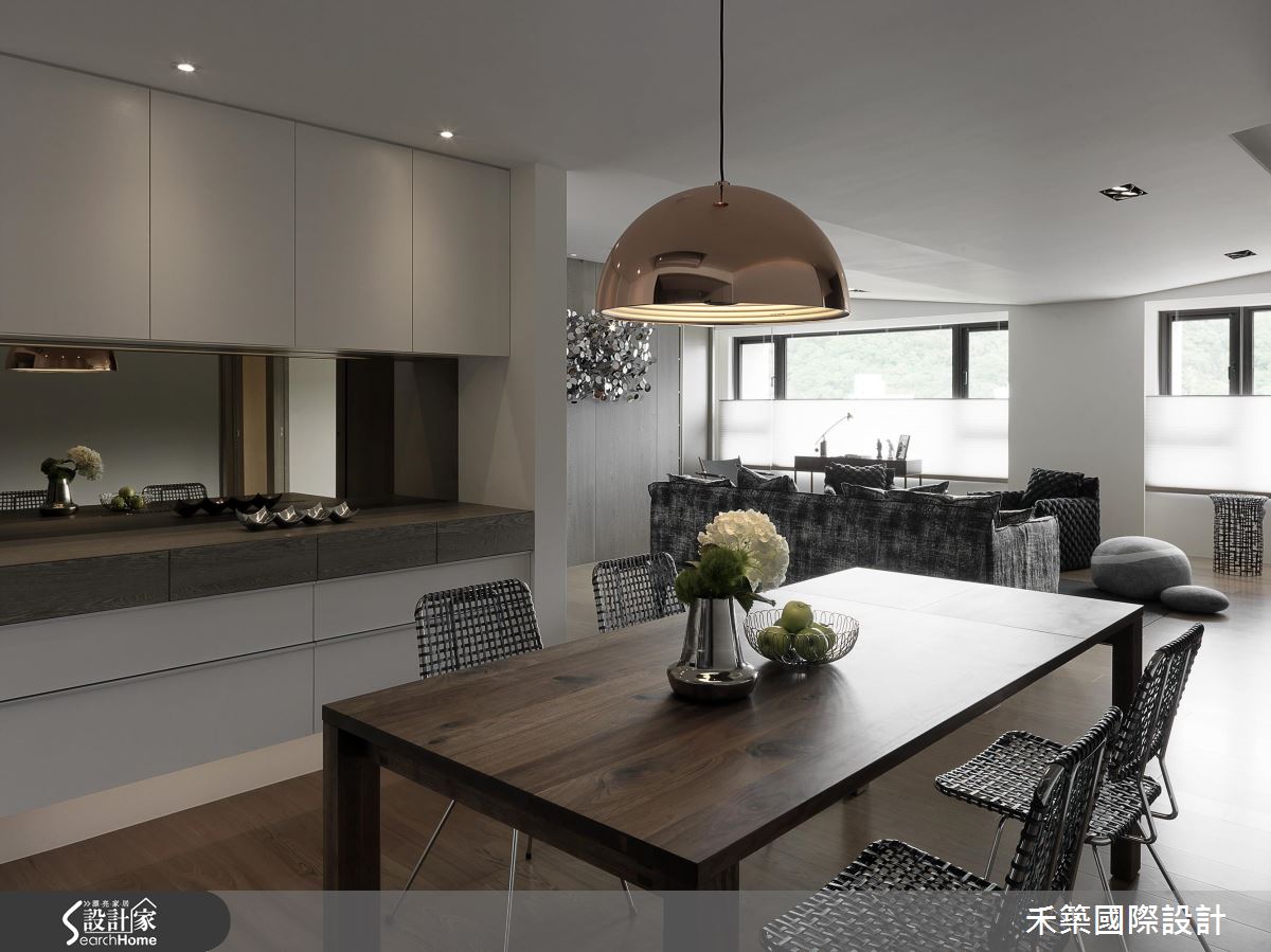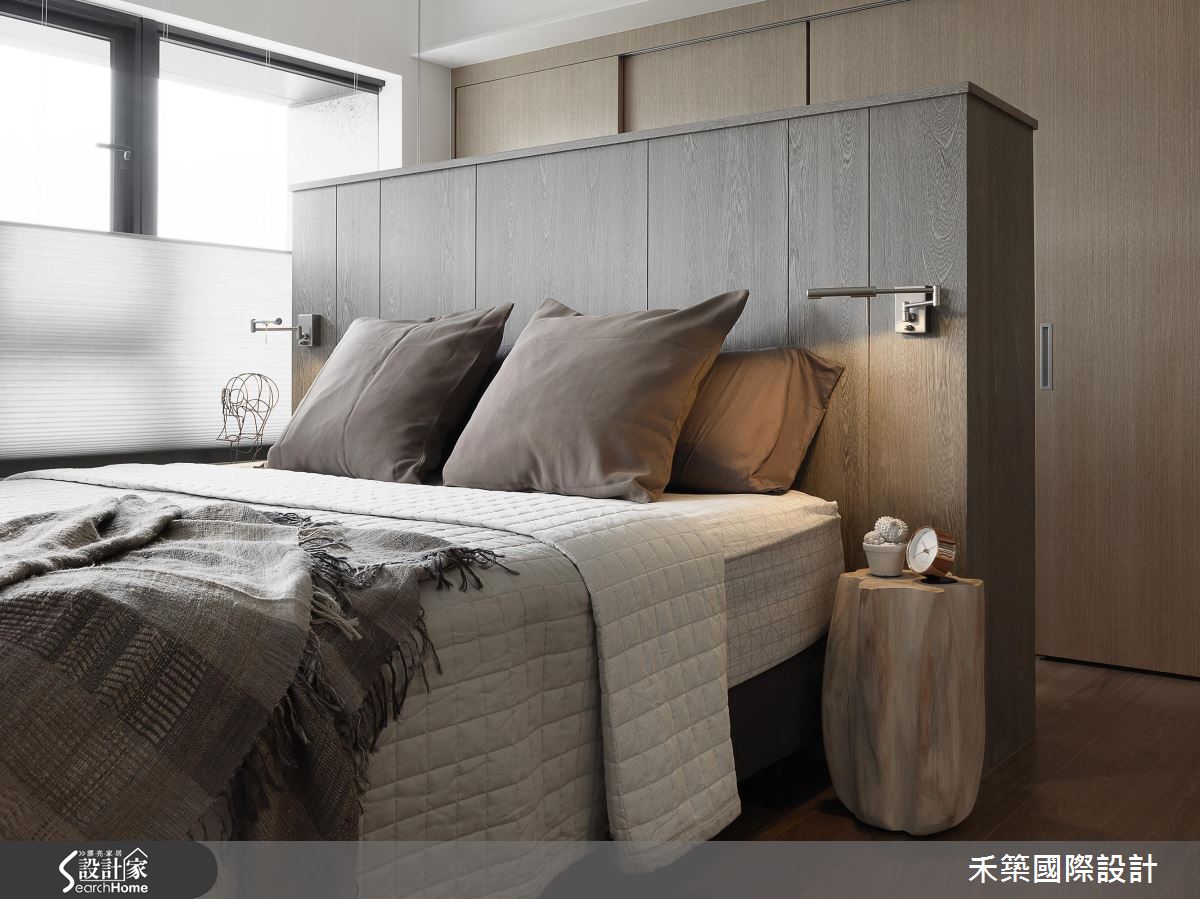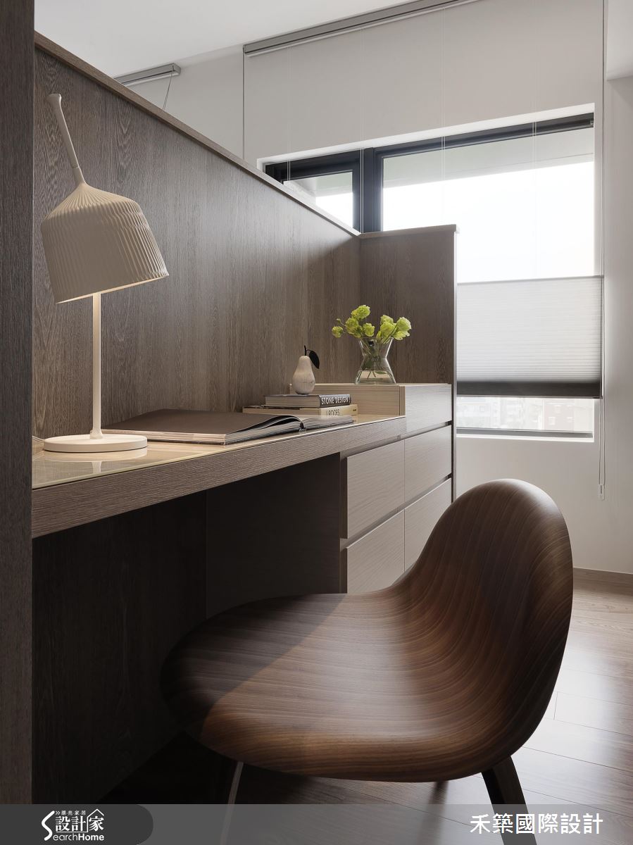 玄關規劃展示收納櫃體,配置一道鐵件玻璃拉門,連通至客廳,做出適度的場域區劃;廳區利用天花降板包覆大樑、削弱視覺壓迫,且做出些微傾斜角度、型塑線條層次,客廳則呈開放格局配置,家具給予靈活環狀陳列,隨時可因應不同需求調整位置,並打破制式電視牆表情,改擺設畫作聚焦視覺;書房、廳區之間採以彈性拉門做出分界,讓陽光可恣意穿引流動,並兼具場域之間的隱密需求;餐廳牆面嵌入電視,讓用餐時段兼具視聽娛樂,再加入透光霧面玻璃界定廚房,達到援引光線、阻絕油煙功能,旁側餐櫃於腰帶處鋪陳鏡面,形成延伸放大的趣味視覺;寢臥內以木紋撫觸注入紓壓感受,並將床頭結合書桌,訂製出獨一無二的閱讀天地!