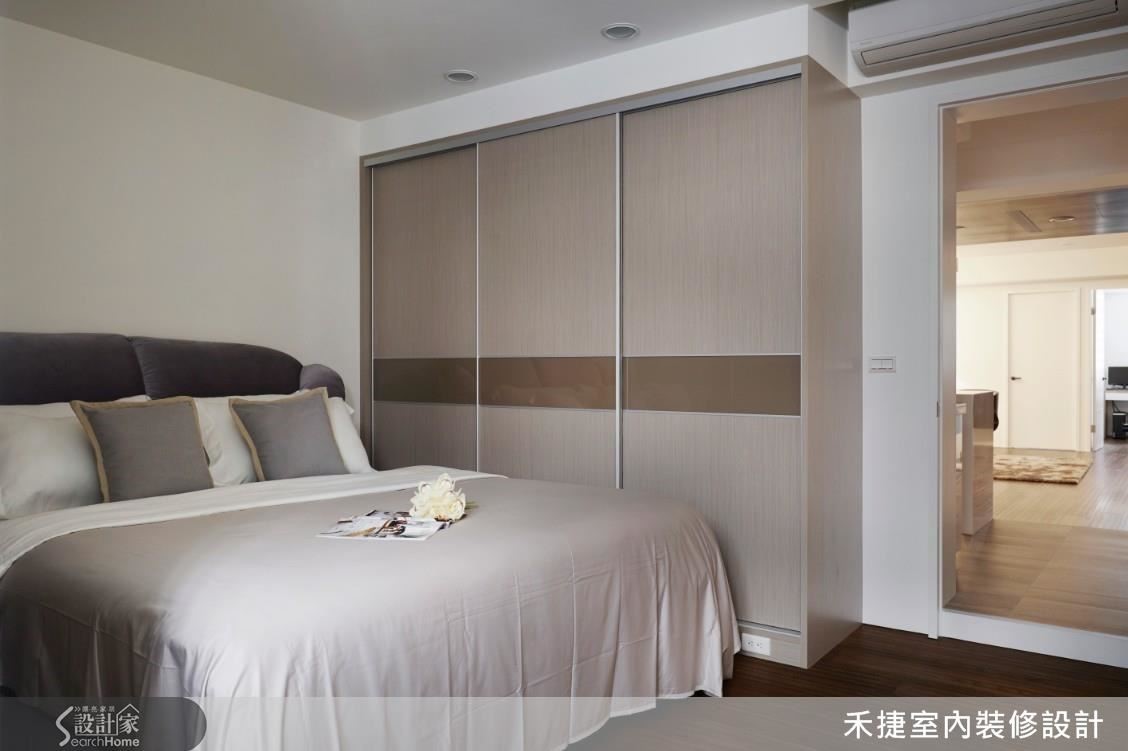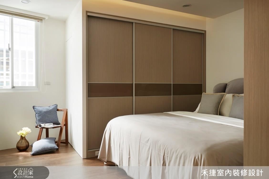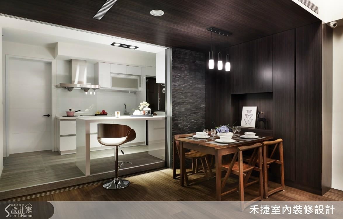 為免除空間壓迫感,並同時達到空間放大效果,設計師以黑玻懸櫃作為主牆視覺,除了兼具玄關收納功能,鏡面效果成功放大狹長屋型景深;背牆同樣以懸吊方式規劃鐵件收納櫃,善用立面空間,降低視線壓迫。針對公領域沒有對外窗的弱勢,設計師則善用暖白光間接照明、清玻材質與溫潤色調配置破除採光問題。餐廳上方利用色調沉穩的帶狀木皮作為開放客餐廳的場域分野,更成為進入純白一字型廚房的連結。設計師將採光保留給私領域,更設置充足櫃體,滿足屋主收納需求。
