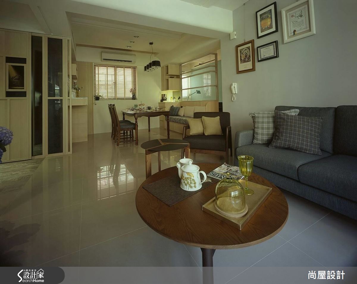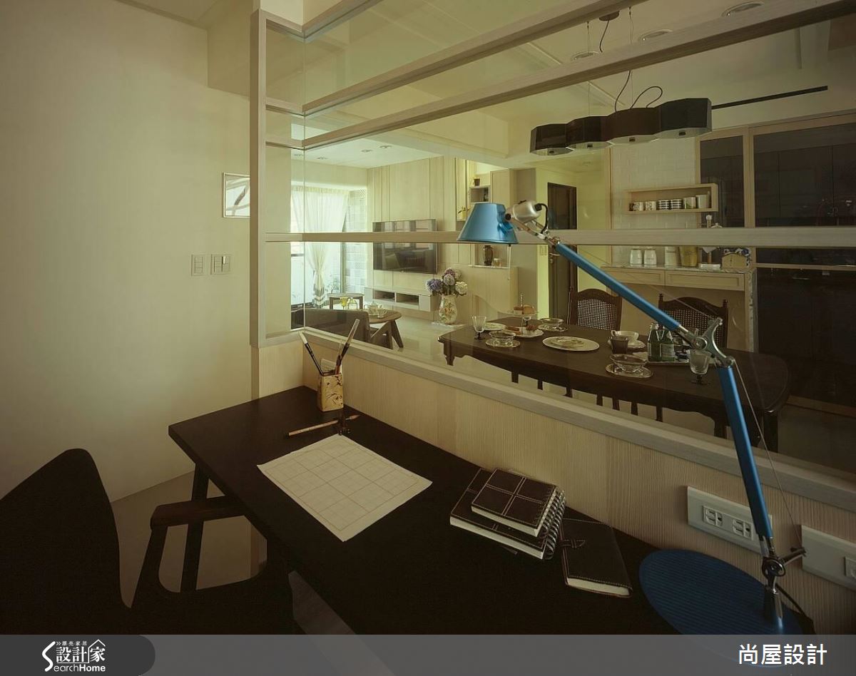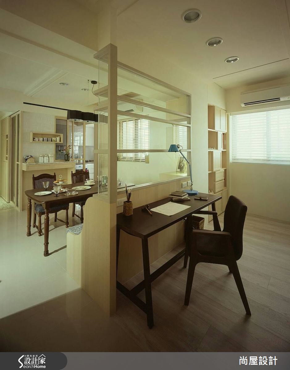 設計師了解屋主需求後,將重點放在格局規劃與風格營造,以屋主喜愛的休閒風格為主軸,規劃清爽、寬裕的居家動線。首先,重劃公領域比例,退縮書房牆面、擴增用餐空間,同時以複合式輕隔間取代實牆,以木作長椅與玻璃營造通透感受。針對壓樑問題,設計師延伸天花線條進行局部包板,化解壓迫危機,卻又不會讓屋高過低。客廳以色調淡雅的家具佈置營造休閒風格,而餐廳與獨立廚房則利用花磚與復古餐桌帶出鄉村氣息。臥室以純白與木色交疊,僅在收納櫃面上做出浮雕花紋,創造優雅的視覺層次。