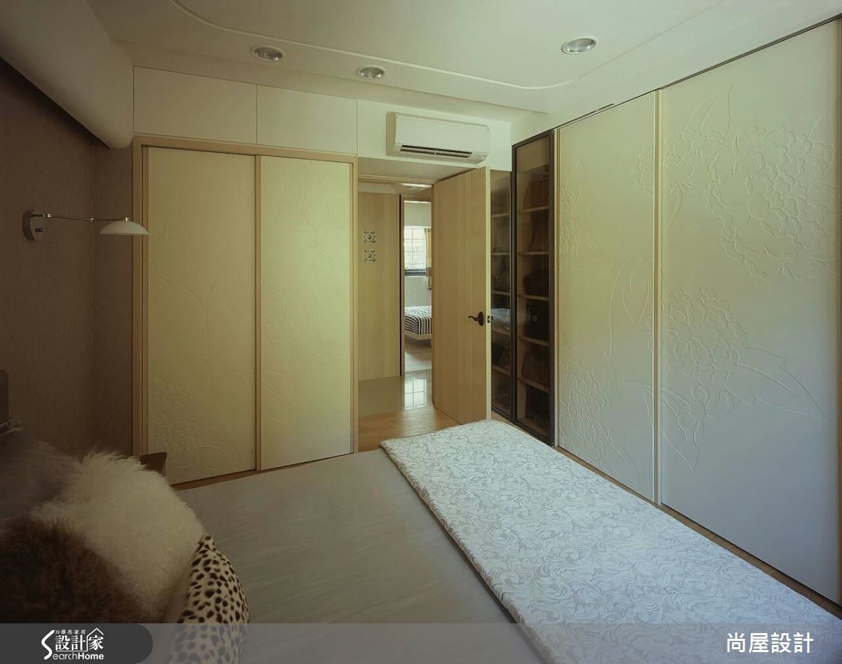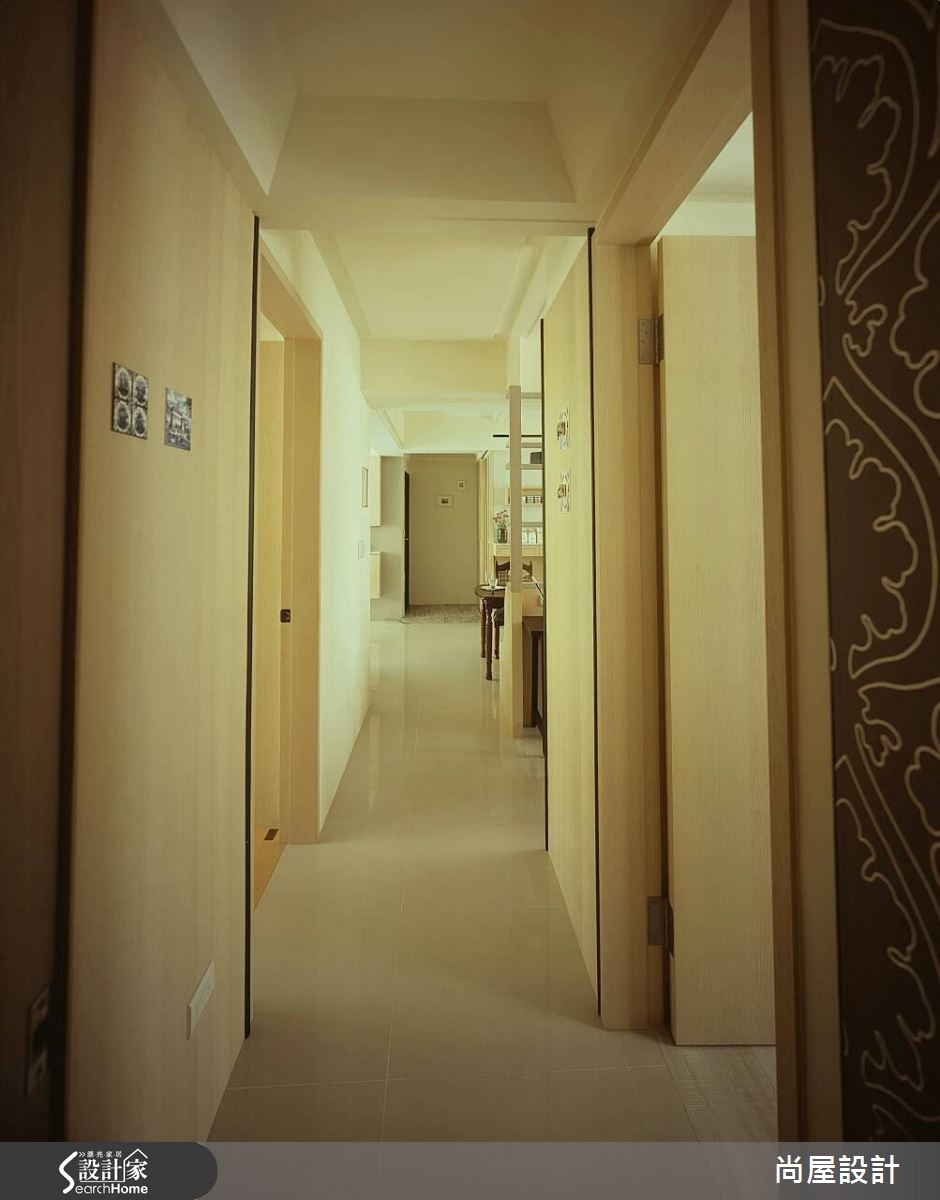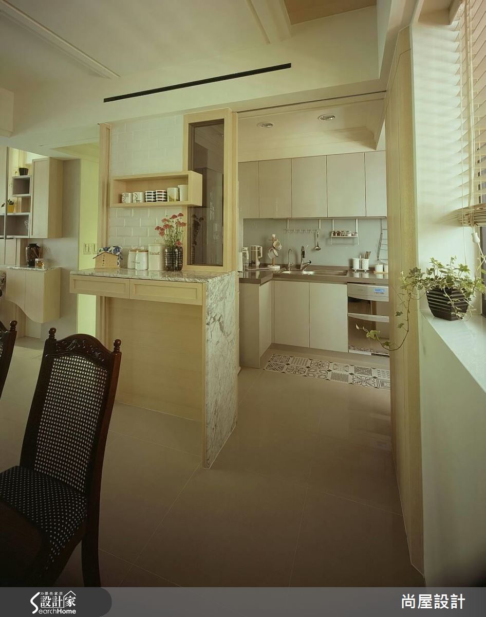 設計師了解屋主需求後,將重點放在格局規劃與風格營造,以屋主喜愛的休閒風格為主軸,規劃清爽、寬裕的居家動線。首先,重劃公領域比例,退縮書房牆面、擴增用餐空間,同時以複合式輕隔間取代實牆,以木作長椅與玻璃營造通透感受。針對壓樑問題,設計師延伸天花線條進行局部包板,化解壓迫危機,卻又不會讓屋高過低。客廳以色調淡雅的家具佈置營造休閒風格,而餐廳與獨立廚房則利用花磚與復古餐桌帶出鄉村氣息。臥室以純白與木色交疊,僅在收納櫃面上做出浮雕花紋,創造優雅的視覺層次。