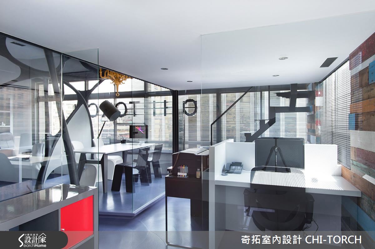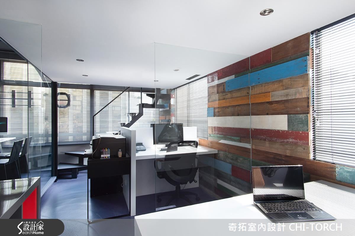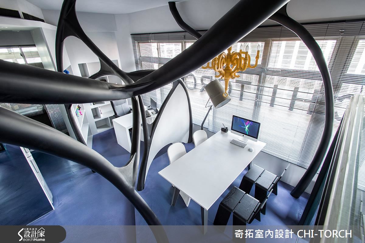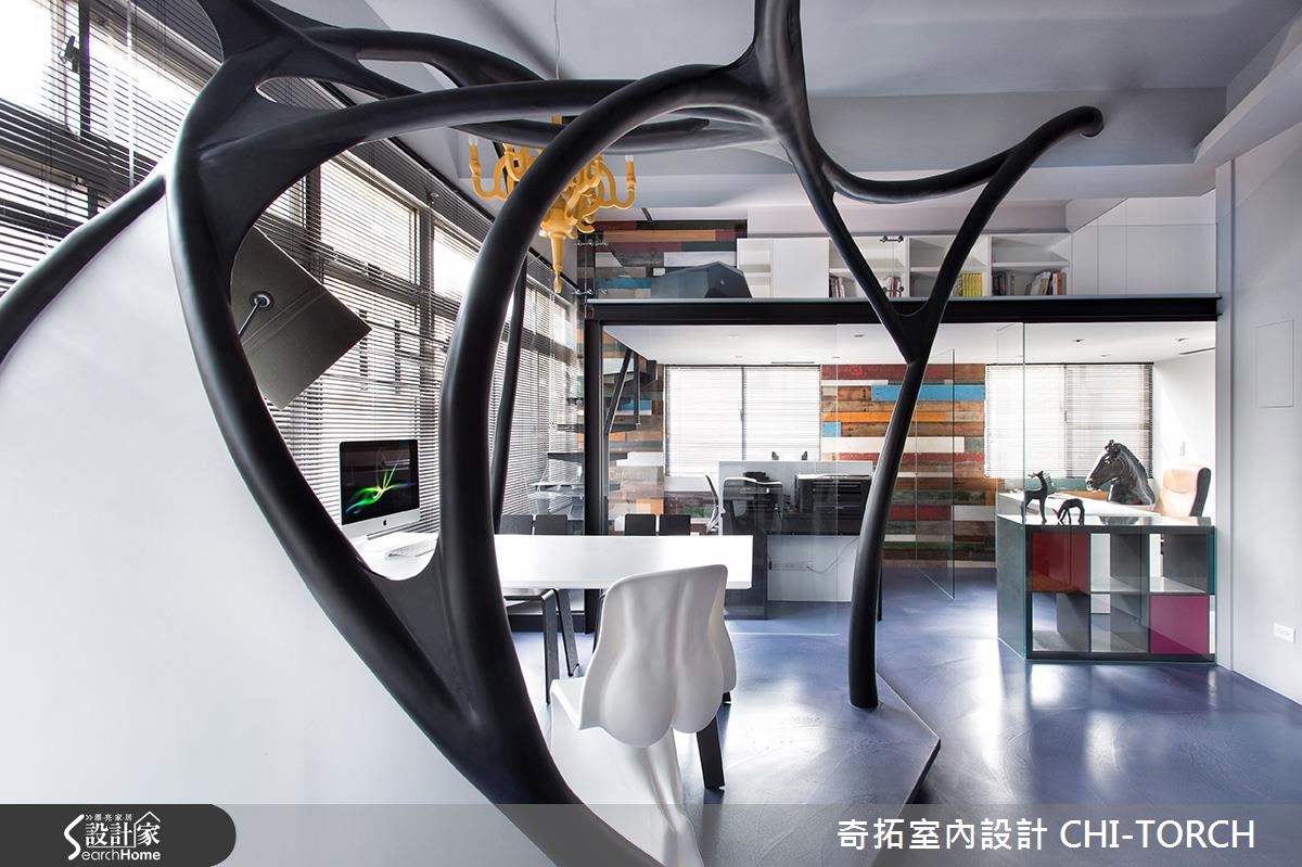 年輕的設計團隊結合多元工法,利用結構複雜的線條,將原先西曬嚴重的中古屋改造為宛如太空艙的前衛辦公室。團隊認為,辦公室應跳脫呆板制式的格局,成為一個利用大腦統籌、思考並激發靈感的所在,因此以「腦神經傳導」意象的開放會議室為中心,巧妙利用宛如神經網絡的線條與地坪階差劃分場域界線。為了達成放大 20 坪空間的目的,利用全開放設計與清玻璃作為解法,更能讓全體在毫無阻礙的空間隨時交流設計想法。值得一提的是,設計團隊選擇一面舊宿舍檜木板牆,凸顯特有的台灣溫度,並延續人文精神,讓過去與未來在此達成一個完美平衡。鐵件樓梯上方是特別預留閣樓空間,除了收納大量書籍,更可成為沉思休憩的所在。
