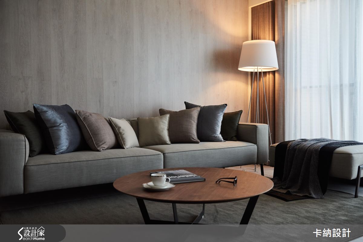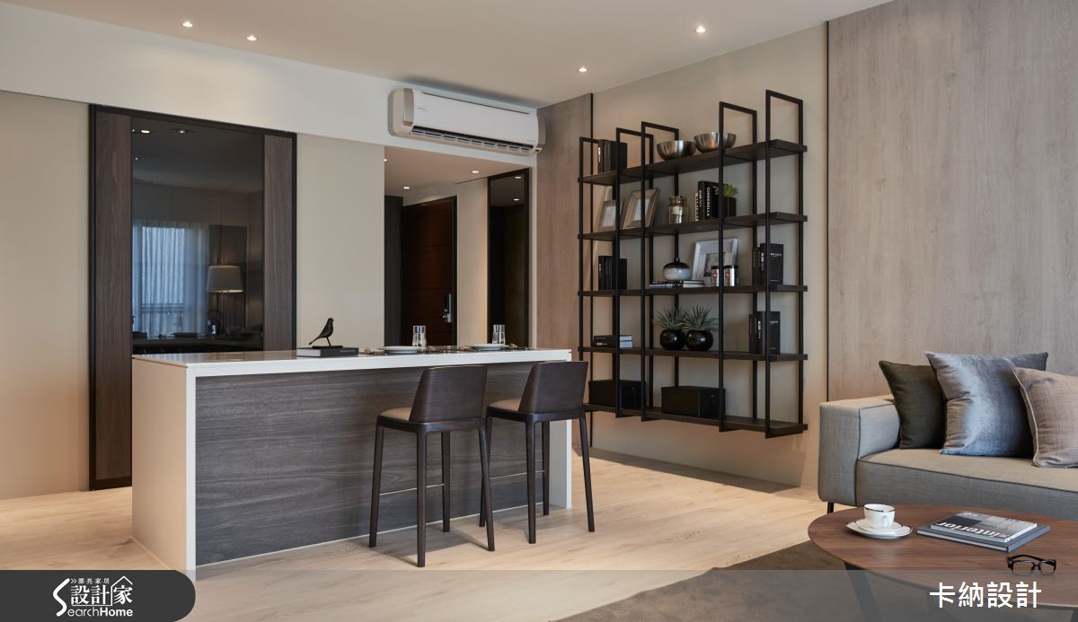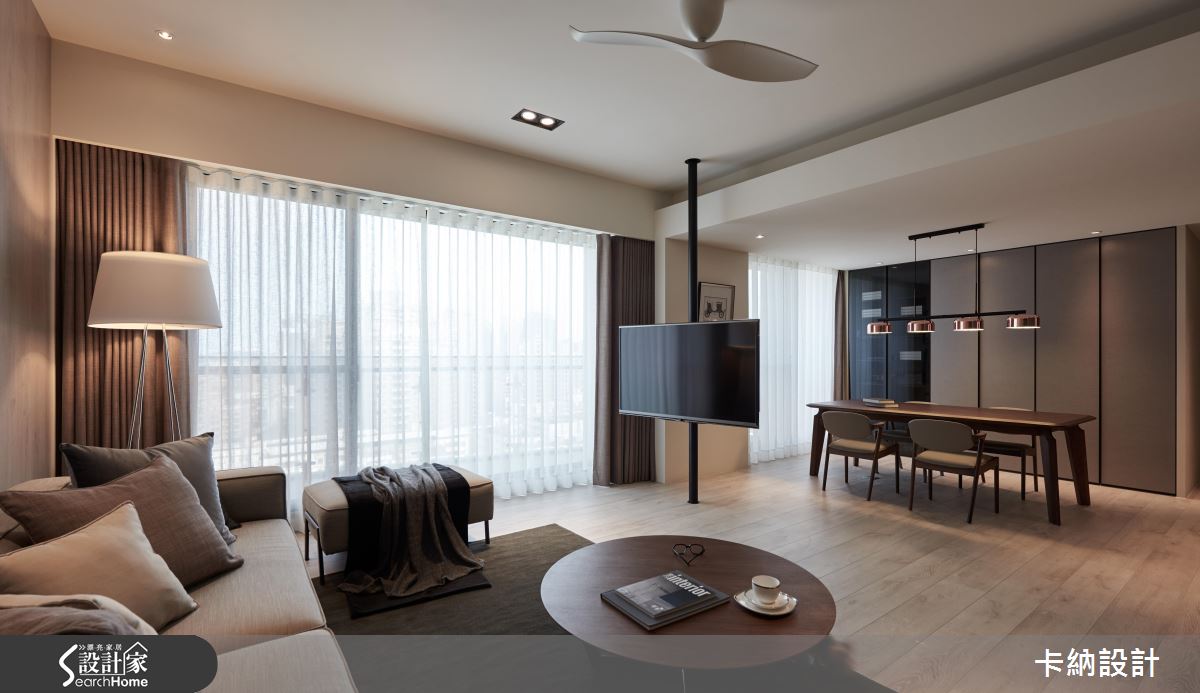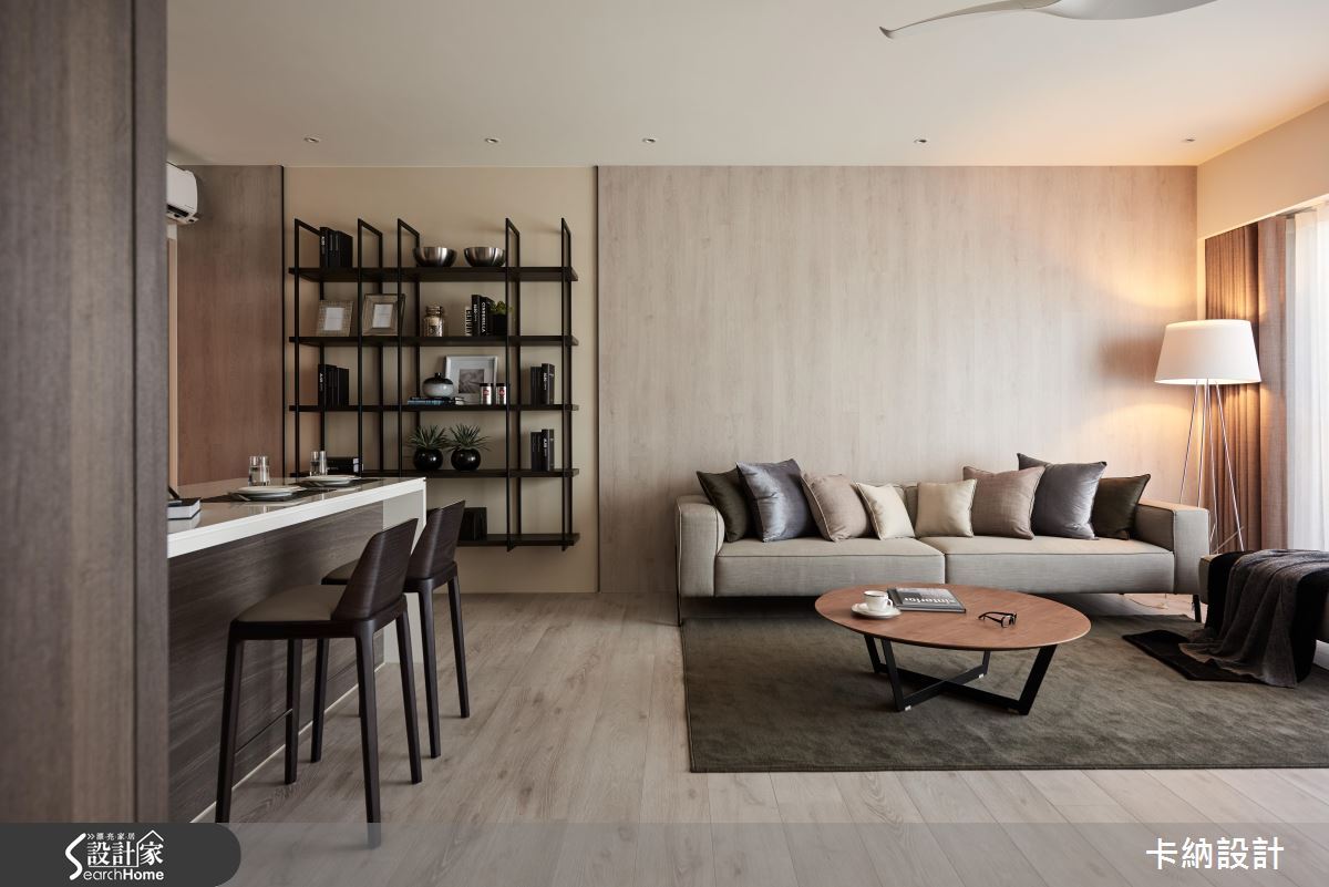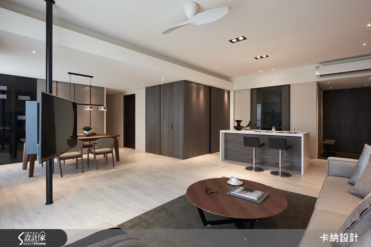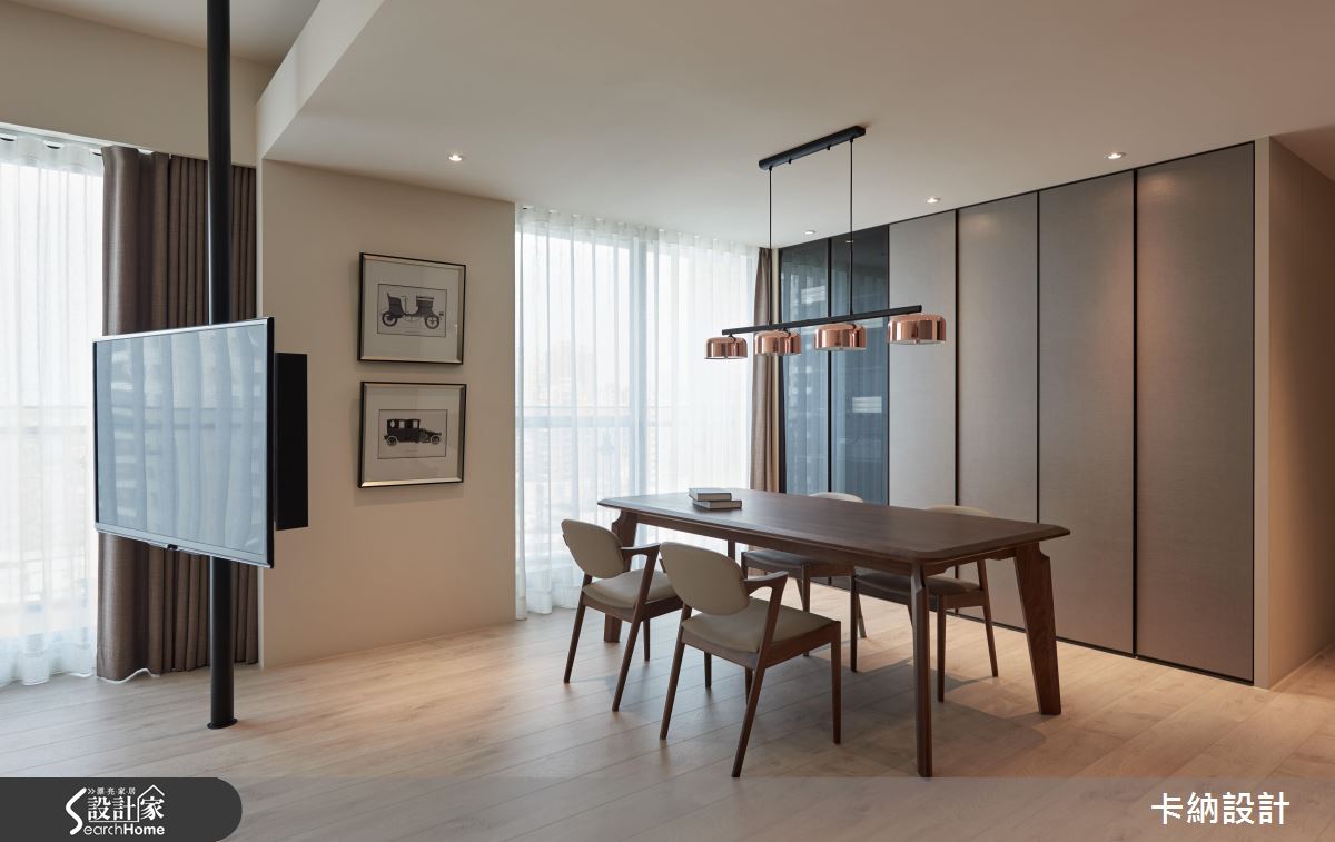 由於屋主一家對於電視的使用率低,又希望能保持公領域寬敞感,因此設計師利用旋轉式鐵件柱體結合電視,抹除實牆體積,更能隨觀看需求移動角度。而為了滿足屋主對於收納空間的需求,則在餐廳旁以大型儲物間收整空間的整潔度。客廳以純粹的大地色調佐木質背牆,搭配溫潤黃光與木地板,在現代空間中創造柔美的自然感受;另外,在獨立廚房旁增設吧台,在開放空間中大幅提升家人的互動度。設計師在淡雅色彩中注入鐵件鏤空層架、金屬吊燈等元素,帶出現代風的俐落氣息。