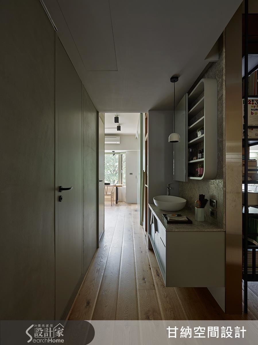 林仕杰、陳婷亮知道屋主一家也有著郊外露營的興趣。於是,就像去露營搭帳篷前的心情,讓空間帶有綠意。從重整格局開始,將臥室與衛浴集中至空間後段,前段大塊區域留給公共活動場域,以一道雙面牆體前為書牆、後為衣櫃再搭配拉門,俐落明快區分空間的不同性質。