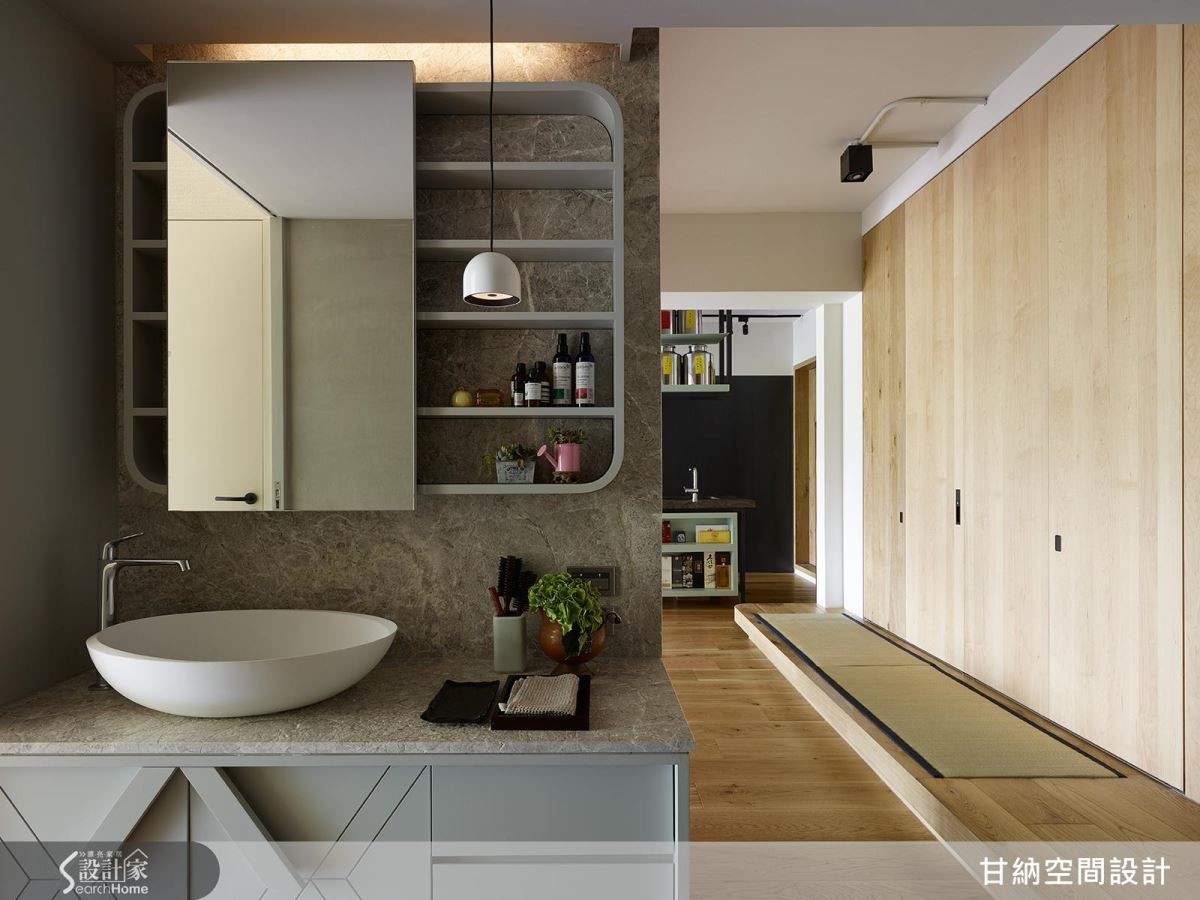 整體以海島型實木地板與實木皮鋪陳,佐以茶道、花草點出家的自然質地;餐桌大理石獨特的紋理呼應有著結眼的樹瘤實木皮書架、門扉,使其靜謐的日式禪風中帶點野性的生命力。