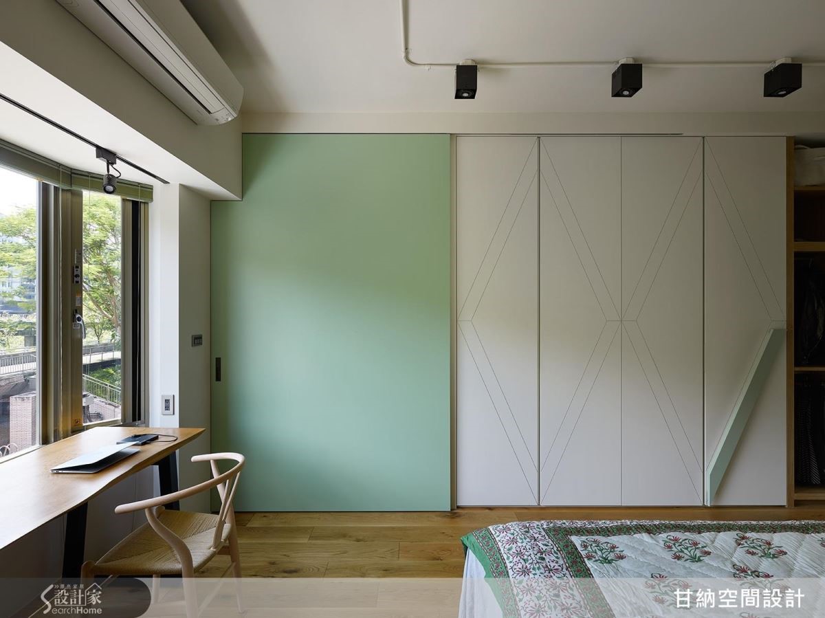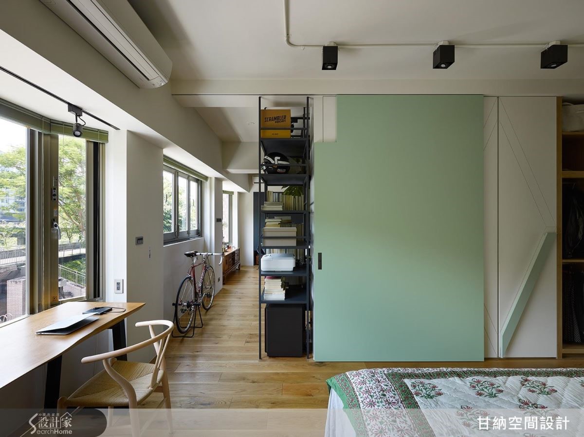 一道雙面牆體面公領域是書牆、面私領域是衣櫃,疊上薄荷綠大面拉門,俐落明快區分空間的不同性質。敞開便自然構成延伸視覺尺度的偽廊道動線。