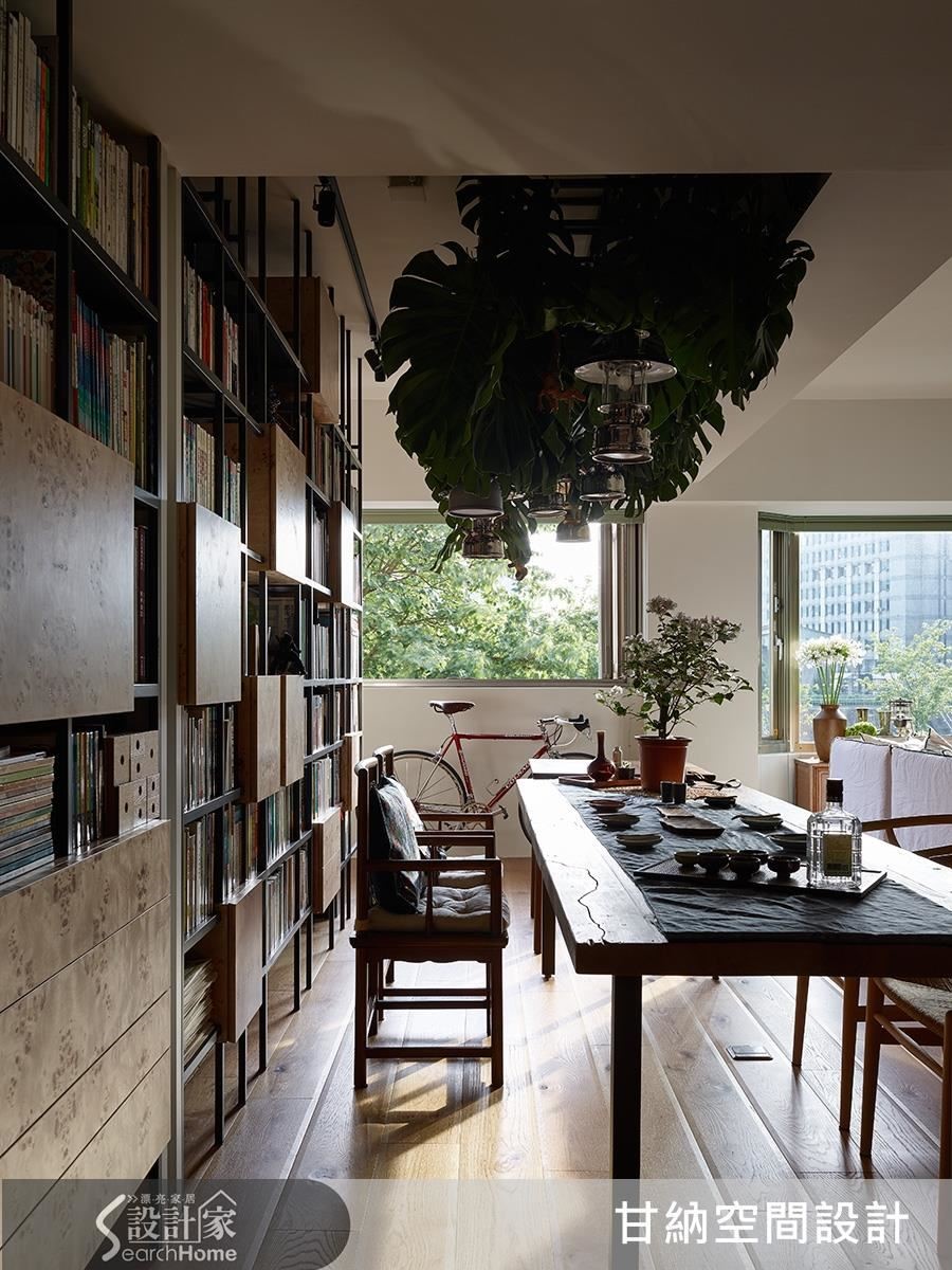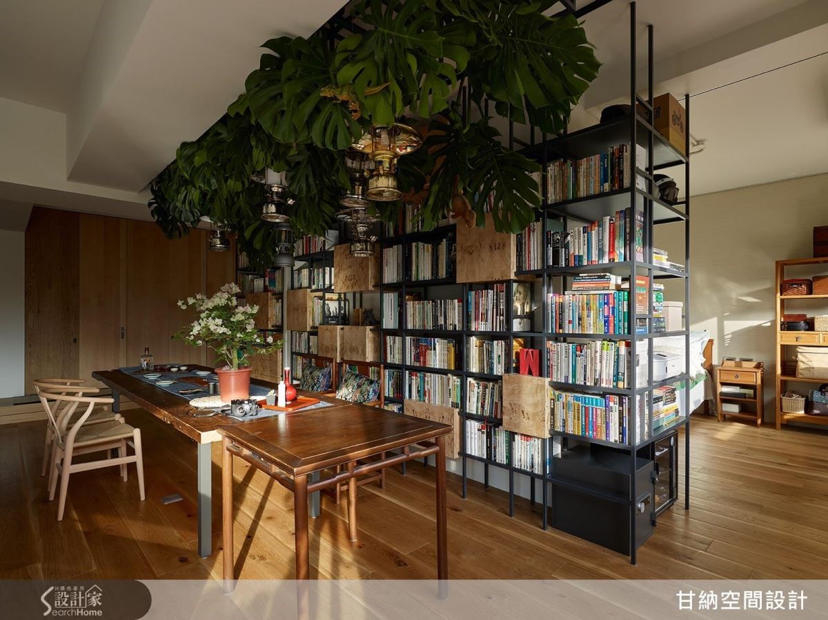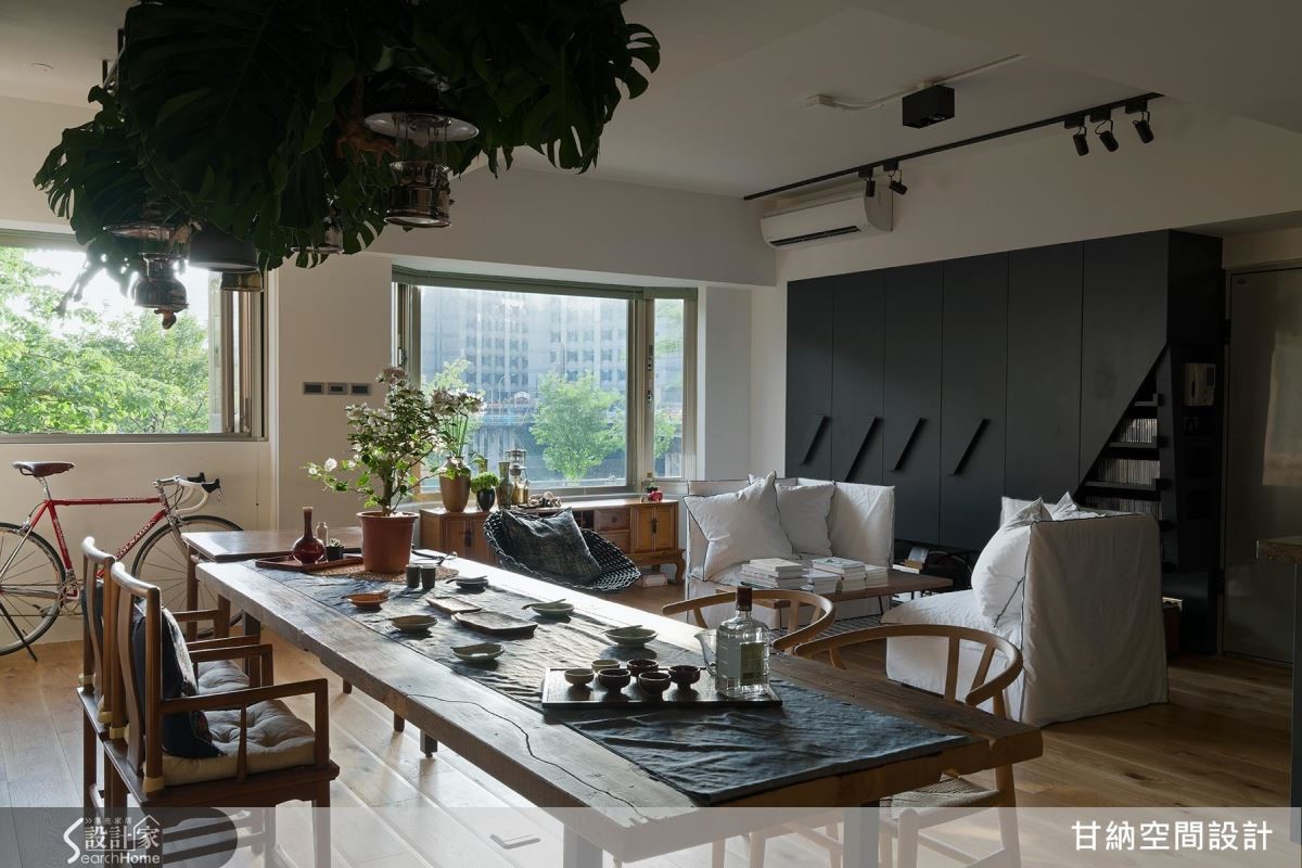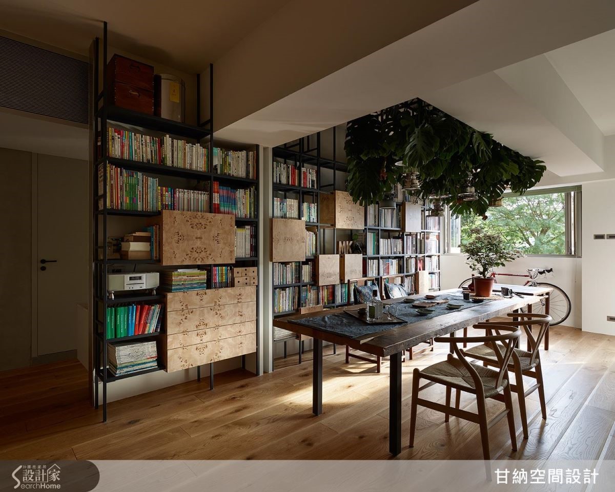 空間開闊了,於是,陽光與綠意進來了,格局的自由開闊,家裡看得見書也看得見樹,安靜又舒服。女主人喜歡茶道與花草,對於家的想像也偏向日式禪風,所以以海島型實木地板與實木皮,讓家中呈現自然清爽的質地,餐桌的石材採用如自然紋理的花色,如溪邊被洗滌的石頭,映襯鐵件書架上的樹瘤木皮,使其靜謐之中又帶點野性的生命力。