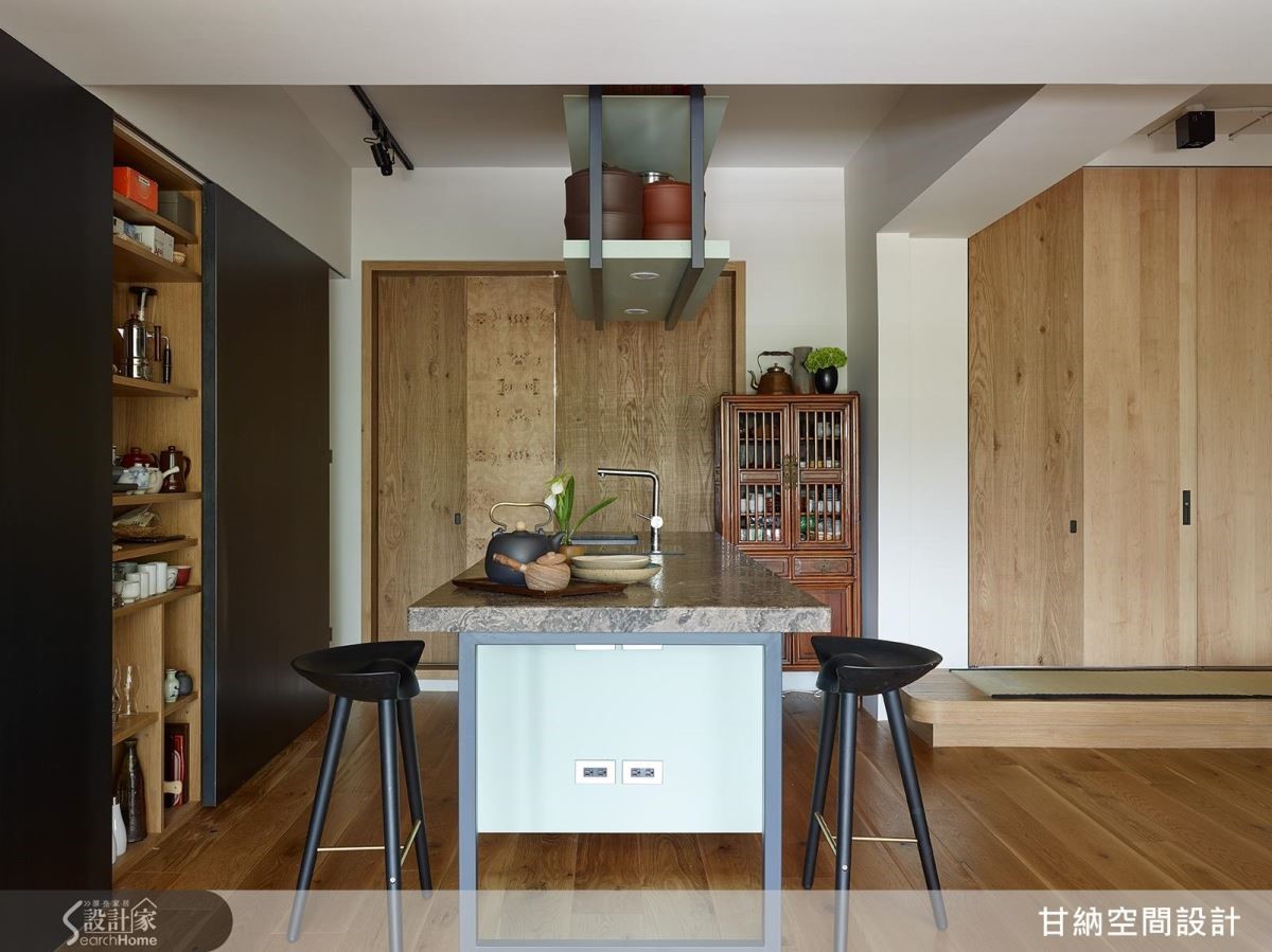 靠近廚房處生來一座中島吧檯,承載閱讀或用餐、小酌或品茗,亦使每個朋友來訪都能自在開心。側邊實木門扉與架高的和室台階,圍出一股獨特日式禪意,實踐相聚的從容恣意。