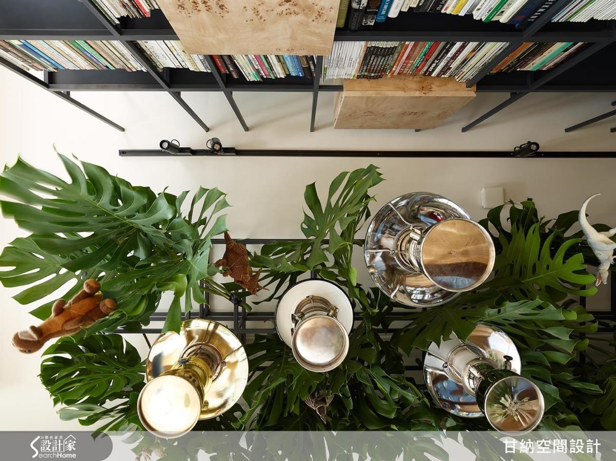 餐桌上方搭起鐵件構架,讓視覺向上拉高延伸,掛上室內植栽與露營用煤油燈作為裝飾更是獨特的收納方法。