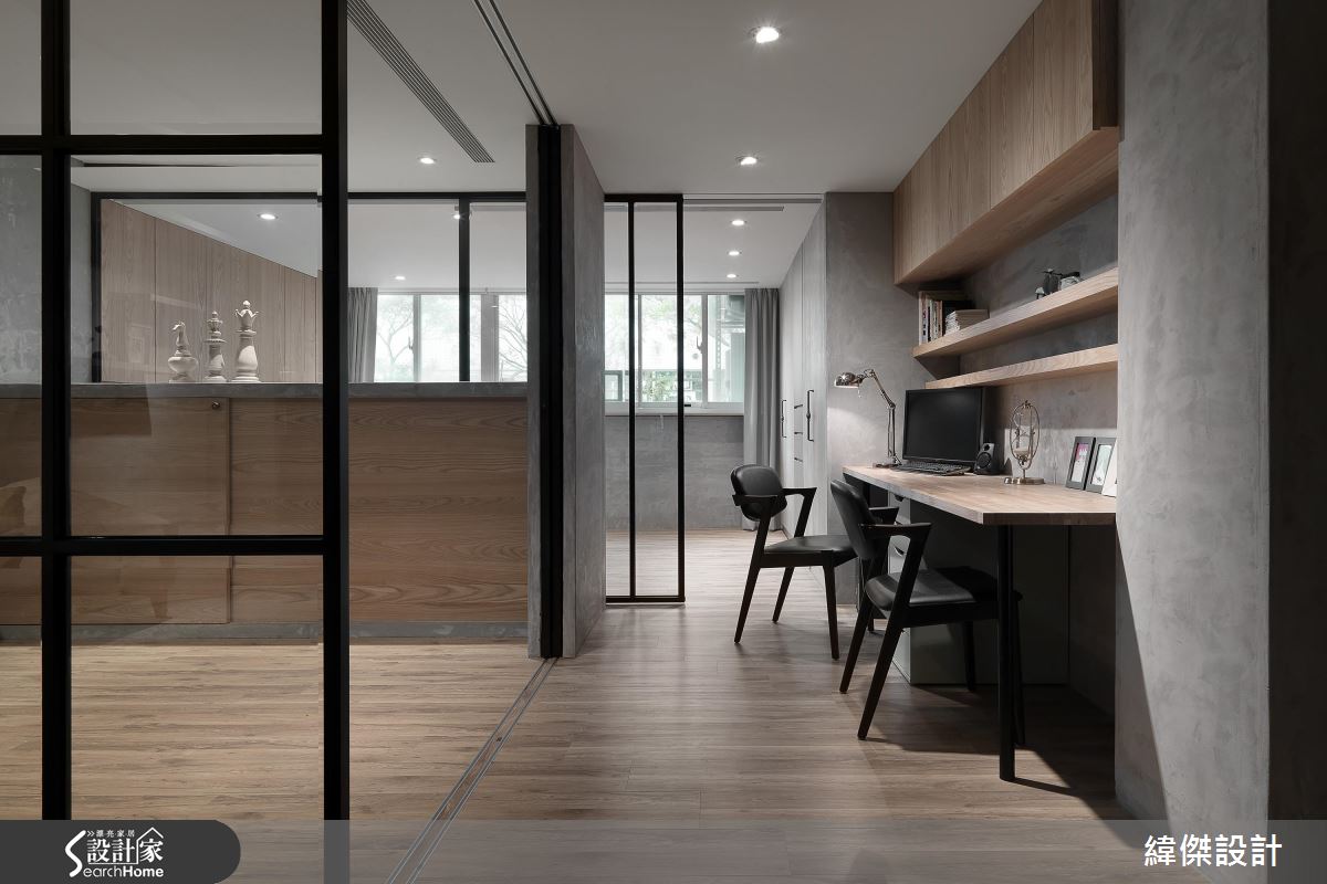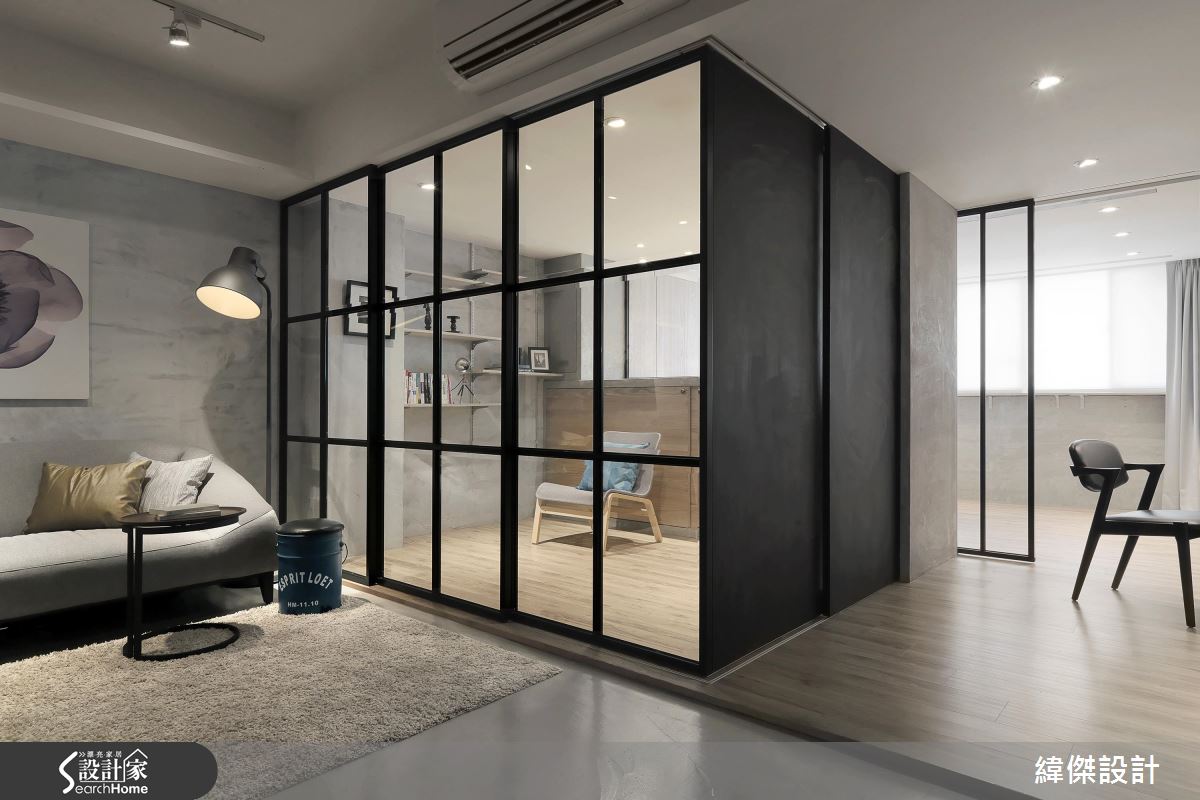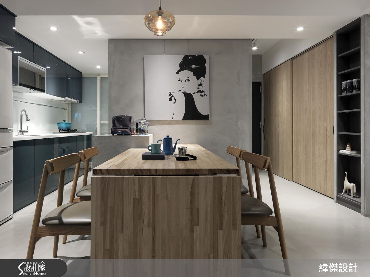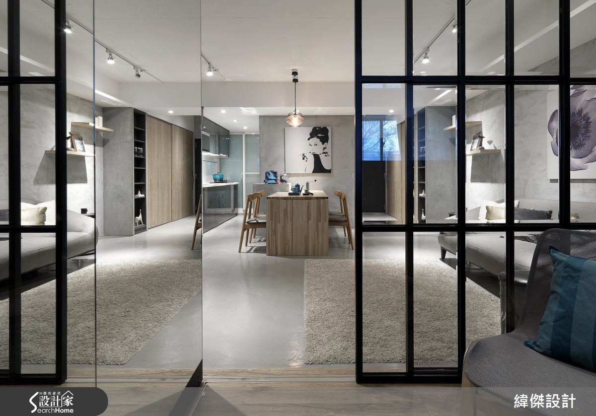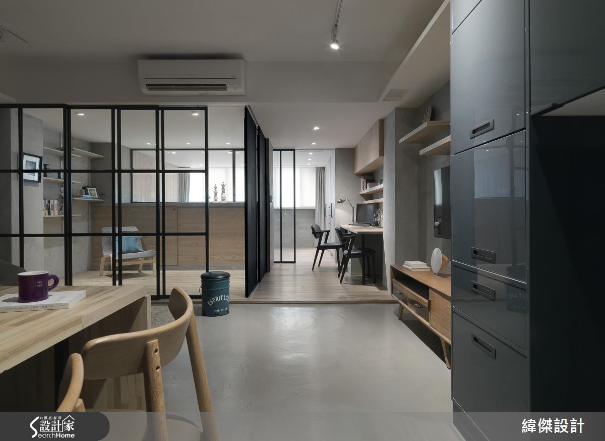 考量到屋主喜歡邀請朋友到家中聚餐,以及想給予小朋友可盡情奔跑的空間,設計師設定寬敞的公共領域,將20坪狹長場域做出有效利用,除去過多贅飾與實體隔間,保有視線、光線的自由穿透,及適度的留白地域,僅利用地坪材質簡單區分廳區與書房,運用鐵件、清玻、鏡面、木質的交織,表現材質特有的肌理特性,構築質樸清新的 Loft 風格;木質餐桌採以彈性折疊款式,創造更大的使用檯面,於牆面懸吊藝術畫作,打造簡約清爽的視覺端景,一旁則連結開放式廚房,創造互動密切的生活動線;寢臥做出室內玻璃窗,維持與其他領域的通透連結,並在床頭收整櫃體,以木紋表述溫潤風采,營造紓壓感受!