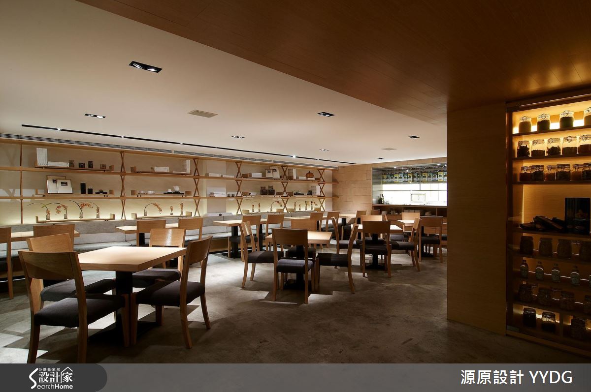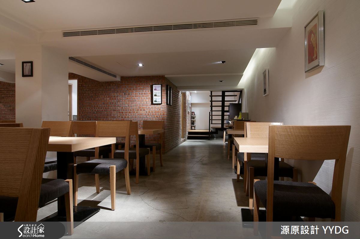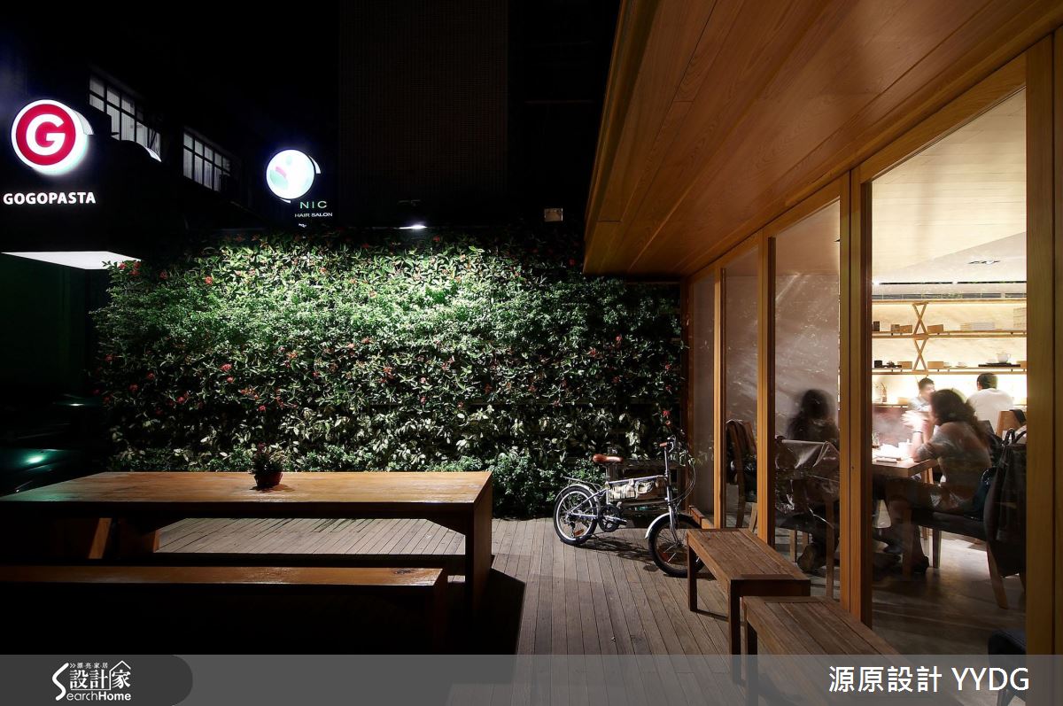 設計師於室外鋪陳木質地板,陳設木長桌,一旁伴有大面積的植生牆,配置整面落地窗結合木框的門面設計,讓室內外視野相互連貫,讓人在室外即可見到店內歡愉的用餐景象;室內則透過材質、燈光營造柔和溫馨的氣氛,用餐區陳設簡約的餐桌擺設,賦予流暢的行進動線,座位區牆面則嵌上層板結合燈光,或懸掛黑框畫飾,增添牆面豐富具層次的表情,並使用復古紅磚鋪述局部牆面,增添自然清新的田園感!