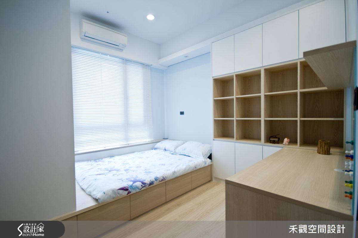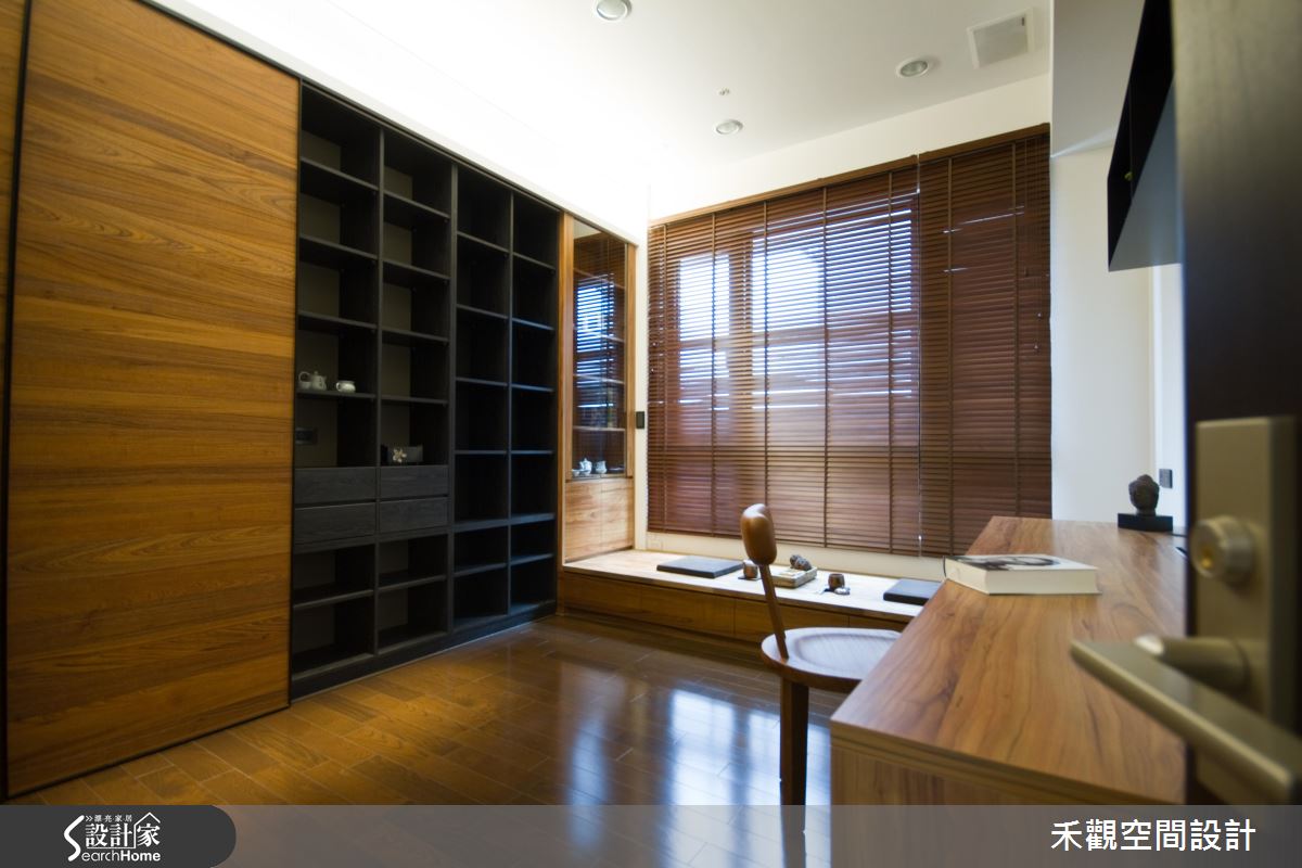 書房窗邊設置臥榻區,讓孩子們可以輕靠在窗邊看書,柔和光影透過木百葉款款流瀉,打造一家人共享的美好閱讀時光。