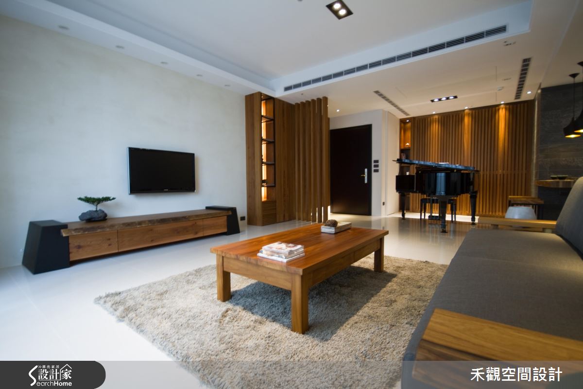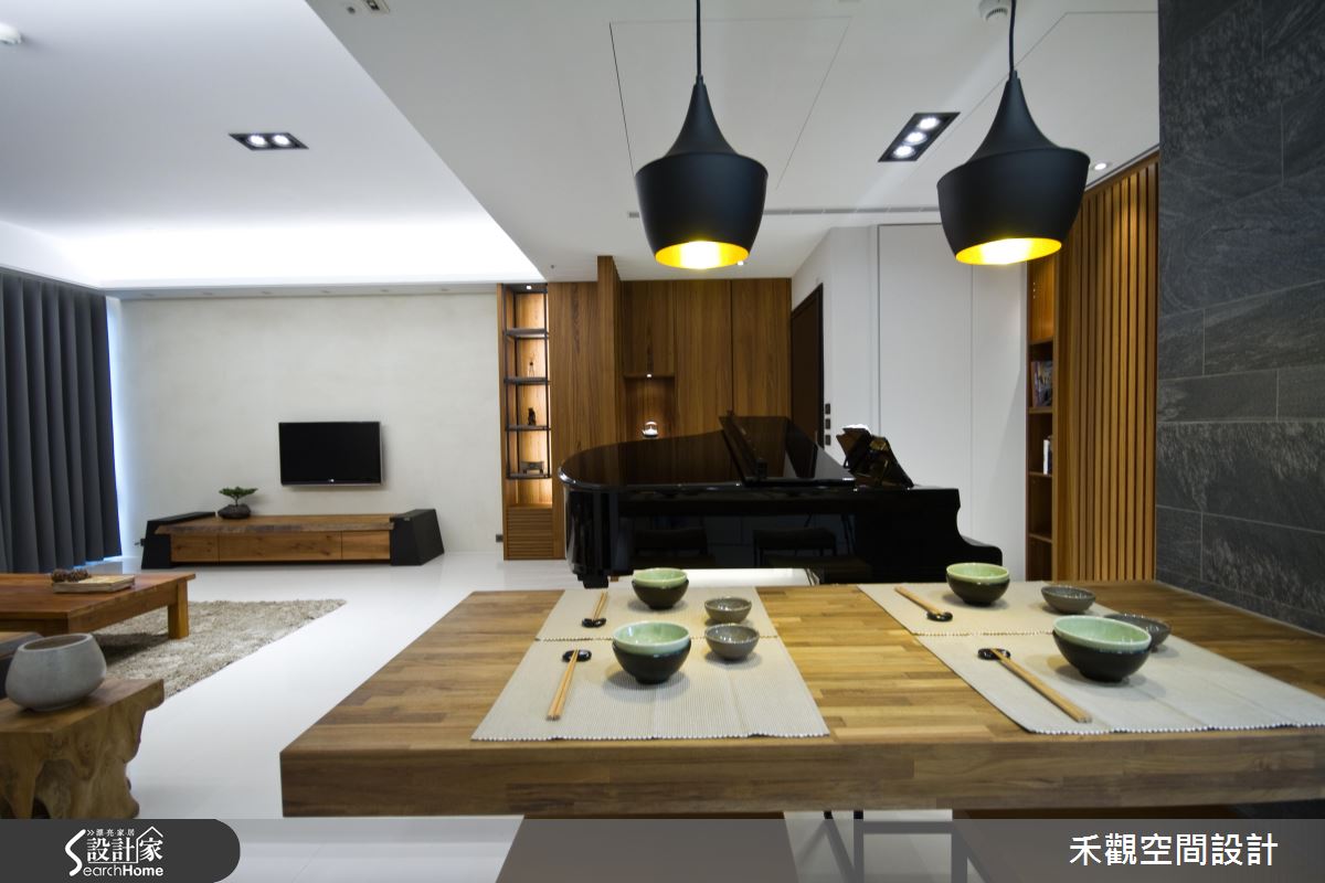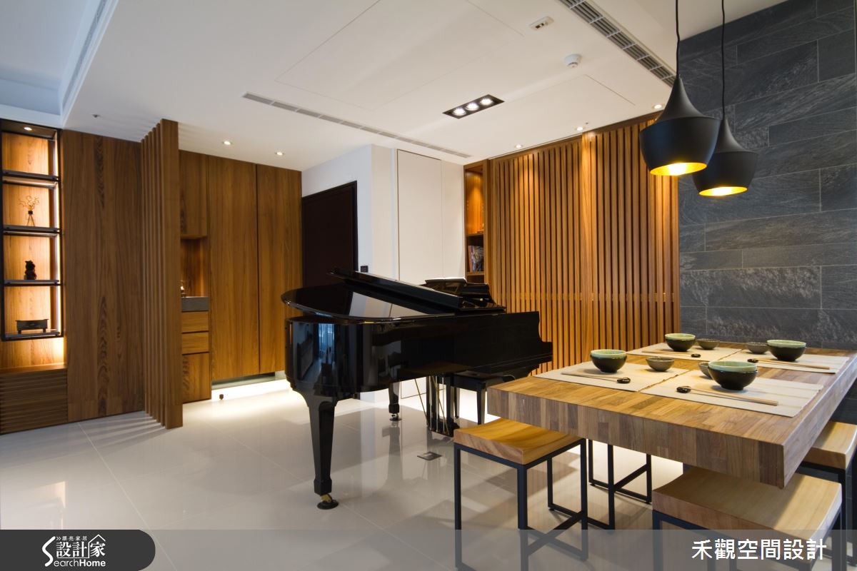 客廳、餐廚區採開放式規劃,客廳主牆以珪藻土為材質,呈現淺灰色底調,襯托出原木電視櫃的優雅簡約,設計師巧妙利用原木的自然紋理、提高視覺層次感,引自然光線與簡明的設計線條轉化,傳遞理性、感性相容並蓄的生活風;實木集成的餐桌以懸空設計處理,機能滿點且不佔空間,優雅的吊燈帶出用餐空間的愉悅氛圍,餐廳區域的部分空間,則規劃為孩子們專屬的練琴區,造型優美的鋼琴居中安置,賦予空間優雅韻味,鋼琴後方的格柵設計,巧妙地隱藏後方的儲藏空間;臥房呈現寧靜的空間調性,搭配木質地板的溫潤色澤,散發安定的溫馨質感;書房區利用木色延續空間溫度,融入人文風雅精神,一整面的落地書櫃採以黑色、原木色處理,營造深淺有致的空間層次!