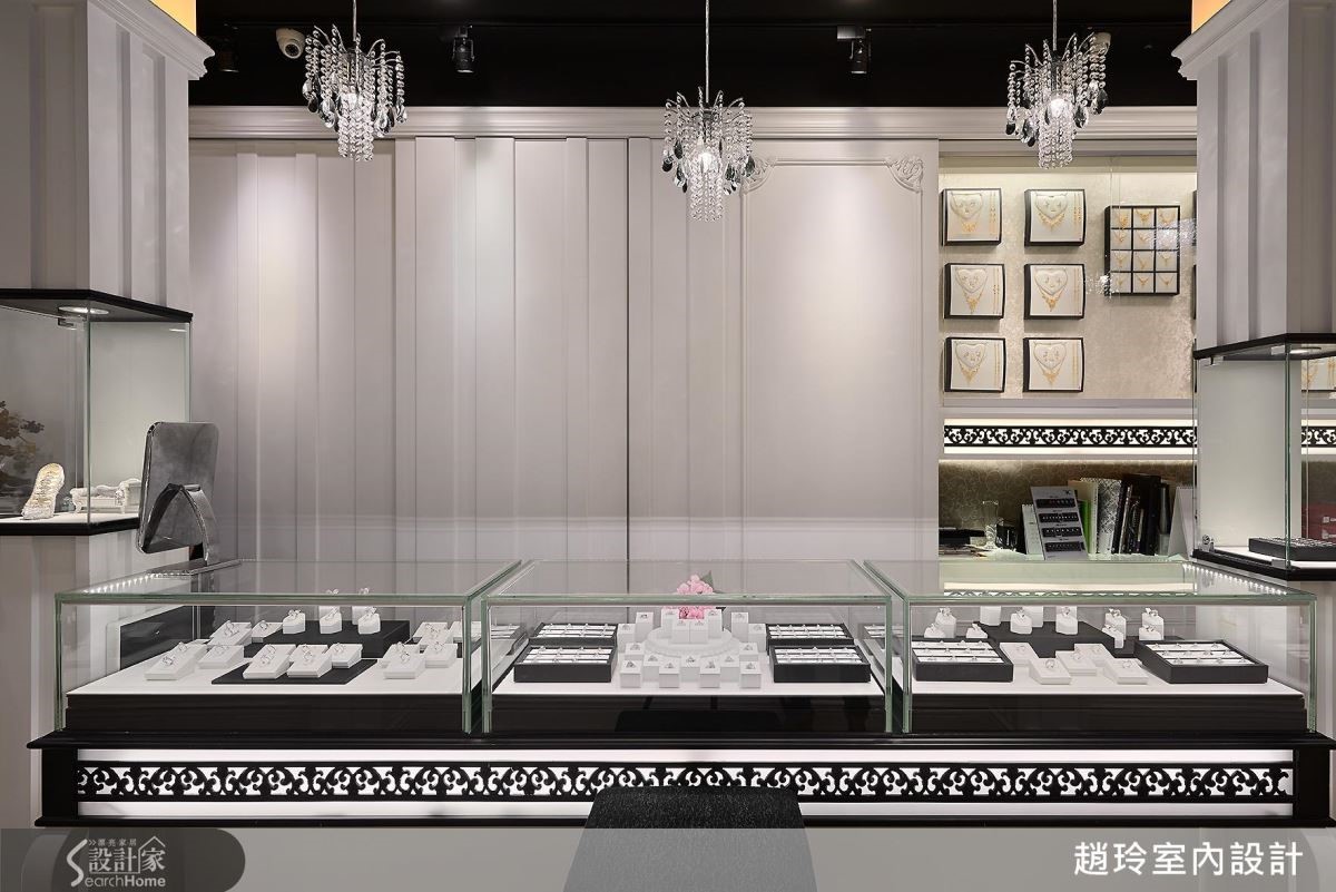 新古典常見的線板以寬度深淺不同作搭配,隱身成為背景,不搶去珠寶的主角風采;再以作工細緻的木工,打造展示櫥窗的黑色透光線板,增添質感,是設計師為店家費心的專屬裝飾。