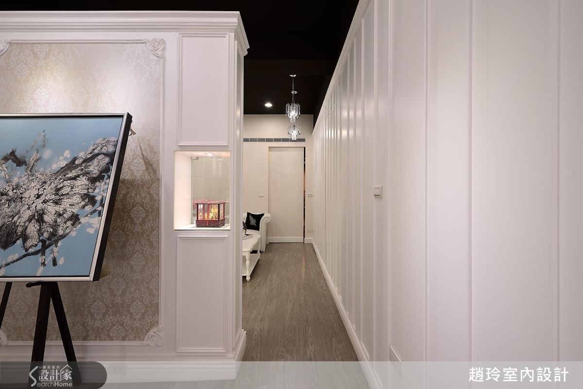 以廊道概念強化長型屋的優點,羅馬柱和拱門造型,最能營造新古典的氣派,也能將視覺向上拉高;層層遞進宛如步向紅毯那一端的廊道設計,引導視覺望向底端的畫作端景,讓長廊刻意變得更長,更具有放大空間的效果。