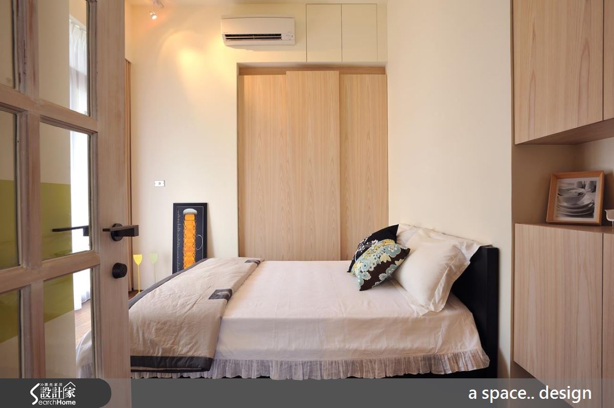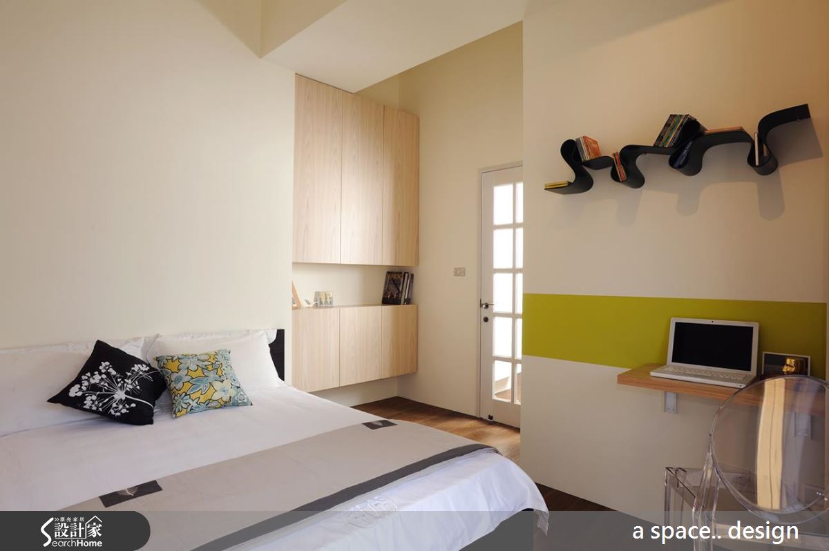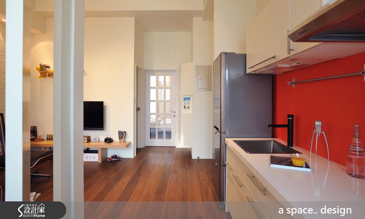 為了完成「採光」需求,設計師拆除制式隔間牆,以 H 型純白鋼柱取代,將城市流光援引入室,帶來大面積自然光感,更以簾幕與旋轉門片材質解除書房、客廳與餐廚空間的界線。客廳以不對稱混搭感家具搭配呈現 loft 風格精髓,並以一面白色文化石牆作為襯托。一字型廚房的鮮橘色烤玻為純白空間注入鮮明的趣味性,並刻意去除餐廳空間,保留寬敞流暢的動線。格狀門片擁有引光優勢,以蘋果綠帶狀色調與色調輕淺的木作櫃體,創造清新可人的舒眠氛圍。
