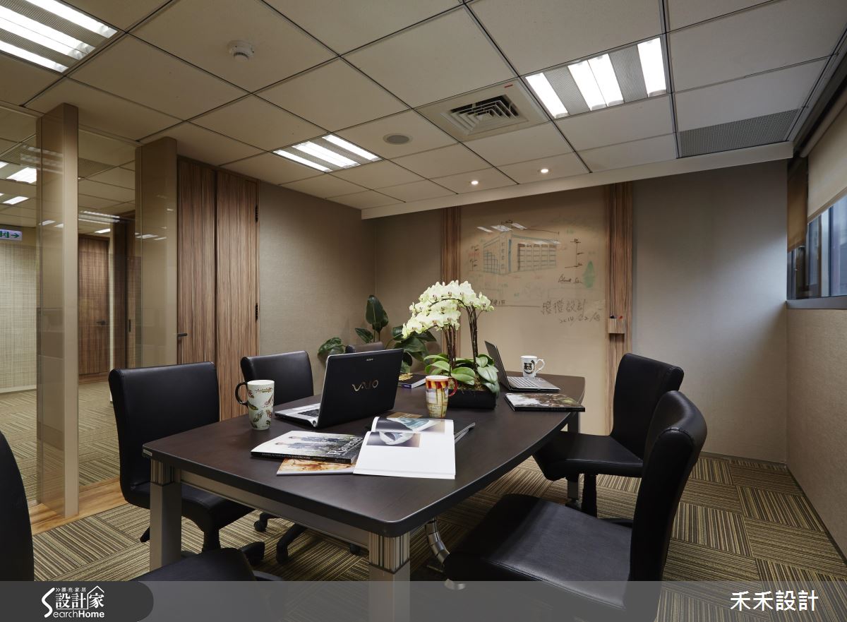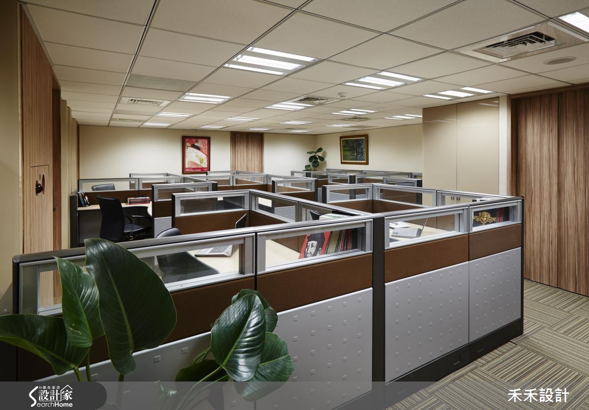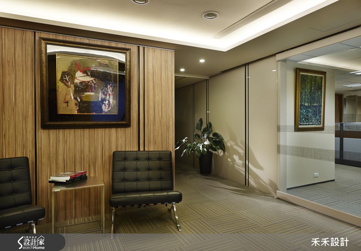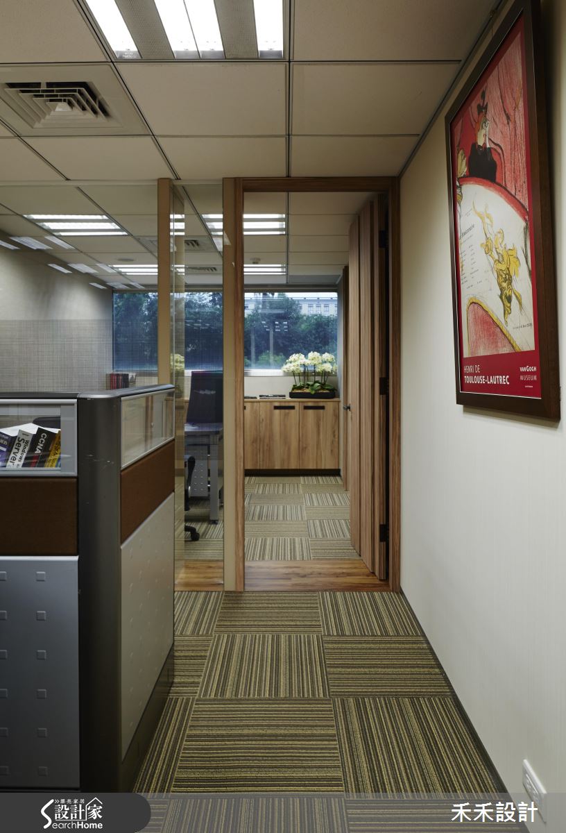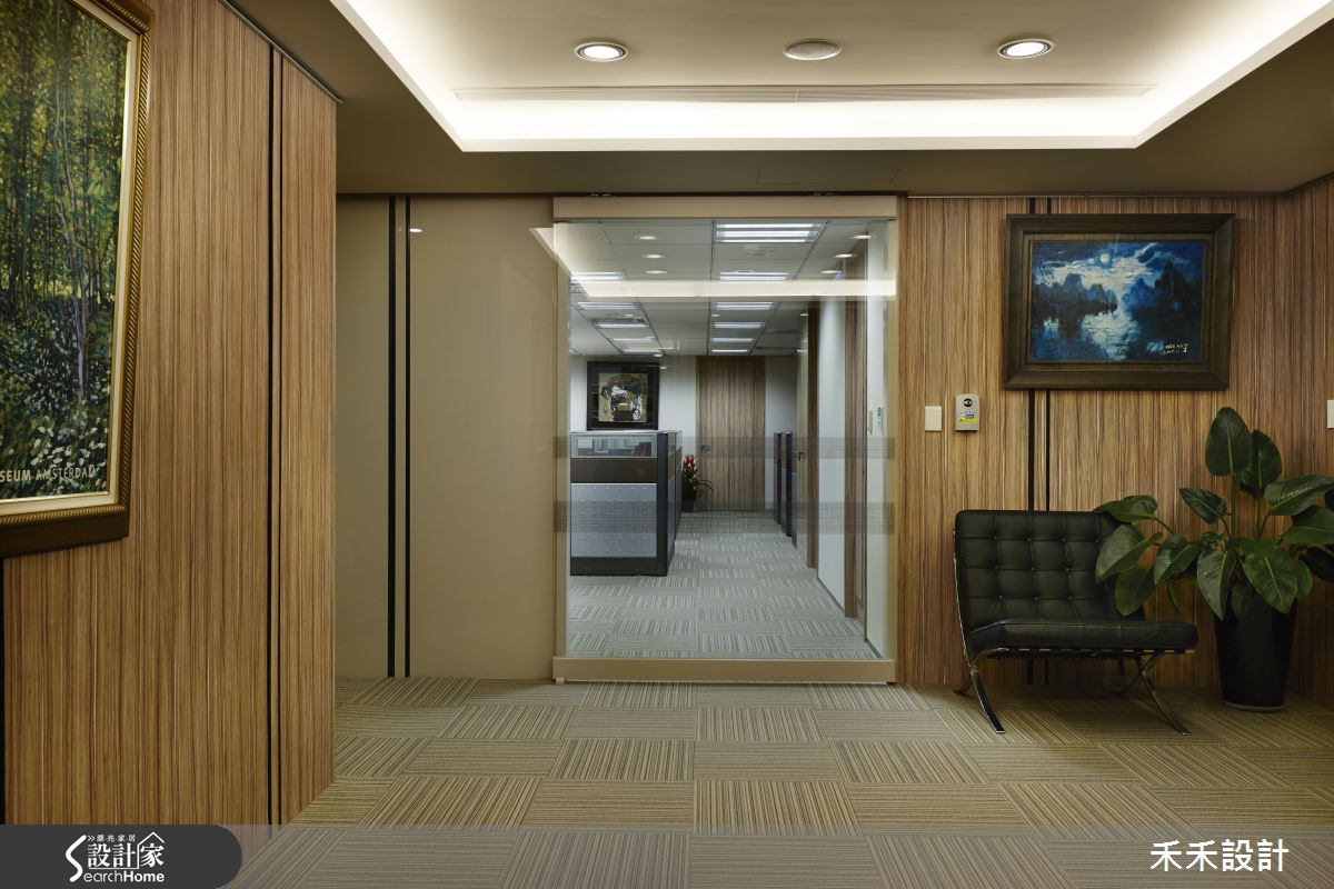 入口處為訪客等待區,天花處採用間接照明,不僅柔和空間的結構框線,也巧妙延展視覺高度,更顯開闊大器的內蘊深度;延伸向下的木質牆面則選用縱向肌理,在自然溫潤感中,也表現出工作場域的理性秩序。進入職員辦公區,色調延續成熟的大地用色,設計師並藉由整齊有致的座位安排和行進動線,以隱性設計自然而然地提升工作效率。主管辦公室和會議室則以玻璃隔間保留通透感,帶來空間放大的效果,而輕盈清透的玻璃也與端莊穩重的木質門板,形成不同材質間的對比。至於收納規劃上,設計師以系統櫃提供良好的儲放機能,並收斂空間線條,塑造簡約清爽視覺。