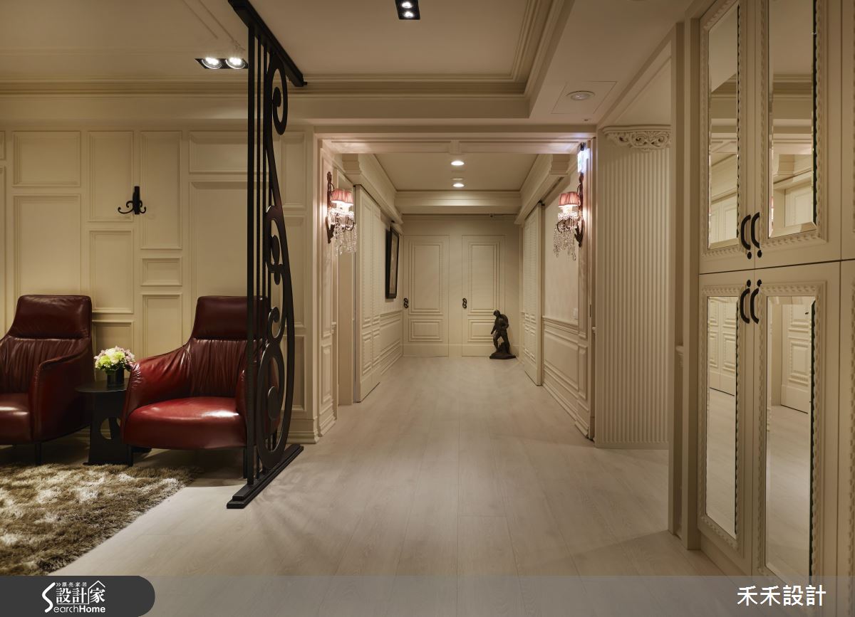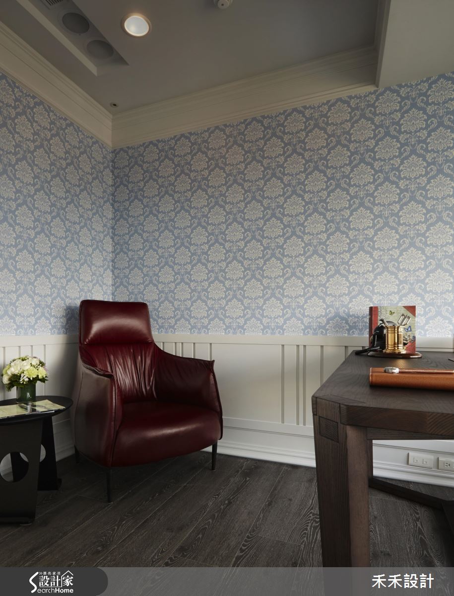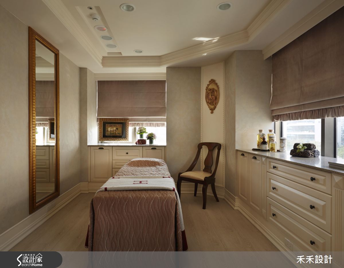 跳脫一般醫美診所的氛圍,一踏入空間便令人讚嘆,環境融入細膩延伸的線板框架,規劃壁爐體現古典氛圍,並透過紅色沙發椅的鋪排,烘托整體華麗氛圍,以尊榮環境安撫顧客等候情緒,且加入鏡面材質或雕花屏風,擺脫立面在視覺上的壓迫感,創造行雲流水的流暢動線;諮詢診間採以藍色壁紙鋪陳,透過櫃體、壁板圍塑空間,營造輕柔的色調背景,鋪述深色木地板營造穩重感,並導引窗景增加採光範圍,創造令人安心的問診情境;診療間加入柔和燈光,藉由壁紙道出細緻風韻,搭配櫃體與桌體配置,塑造放鬆減壓的氛圍,無形激發更有效率地的診療品質!