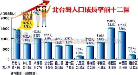 四到十名分別是桃市八德區、新北市淡水區、桃市平鎮區、新北市林口區、桃市蘆竹區、新竹市及桃市龜山區,近兩年半人口增加數從上萬到六千餘不等。
