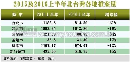 若以縣市別來看,新北市仍是推案量最多的縣市,上半年推案量逾一千六百億元,尤以新店、板橋、中和等地推案量較多。而以往多有千億水平的台北市,則僅剩約八一四億,創下SARS以來新低。北市推案量銳減的主因,是因為市府對新成屋建案課徵囤房稅,且又調高新房的標準單價。在重稅壓力之下,建商索性「不玩了」,乾脆空手看戲,多不願在此時跳進熱鍋裡被痛宰。因新建案供給量劇減,民眾買新房的選擇就受到很大的侷限。