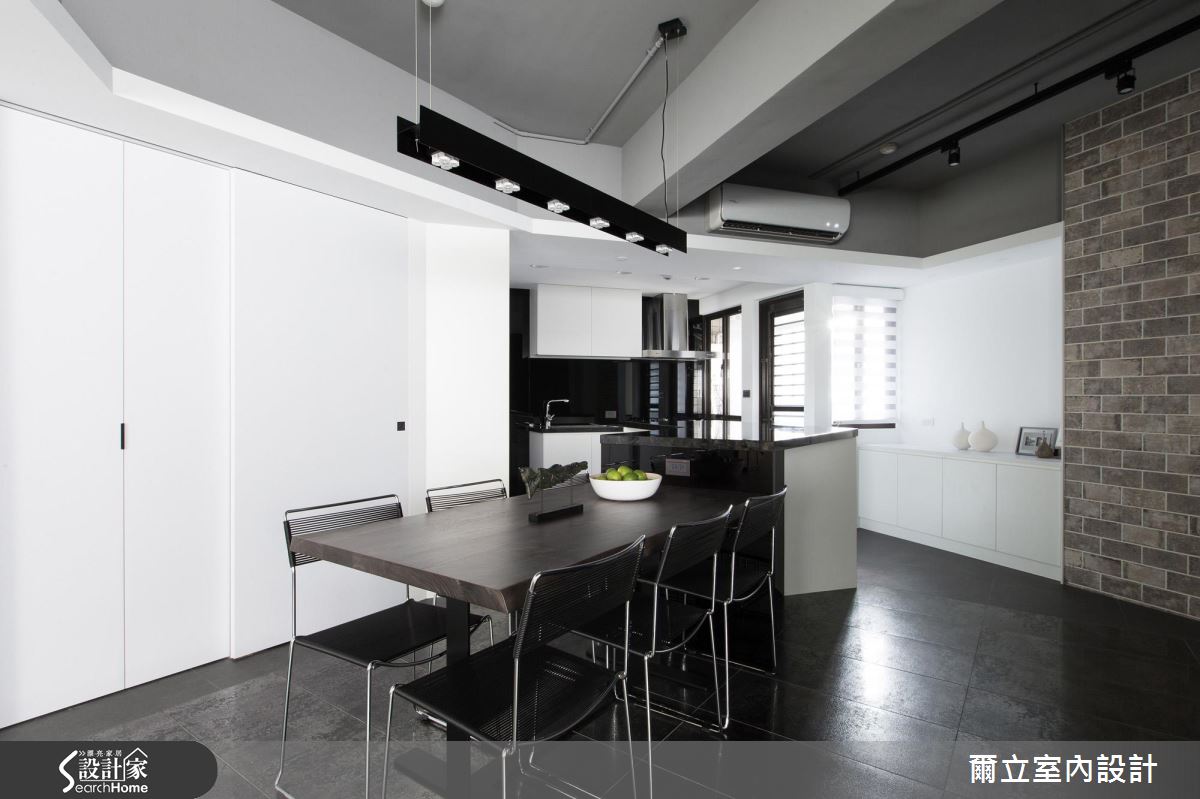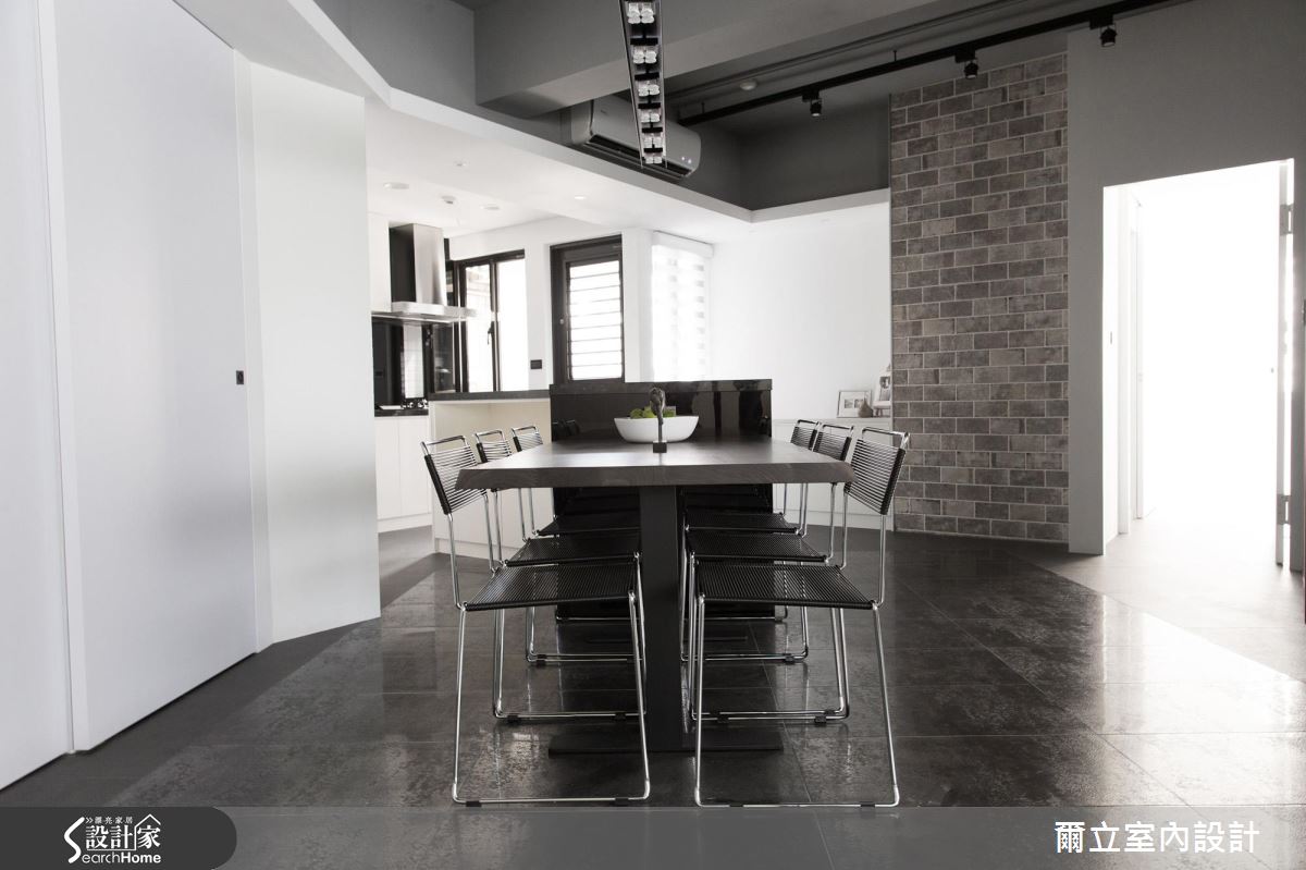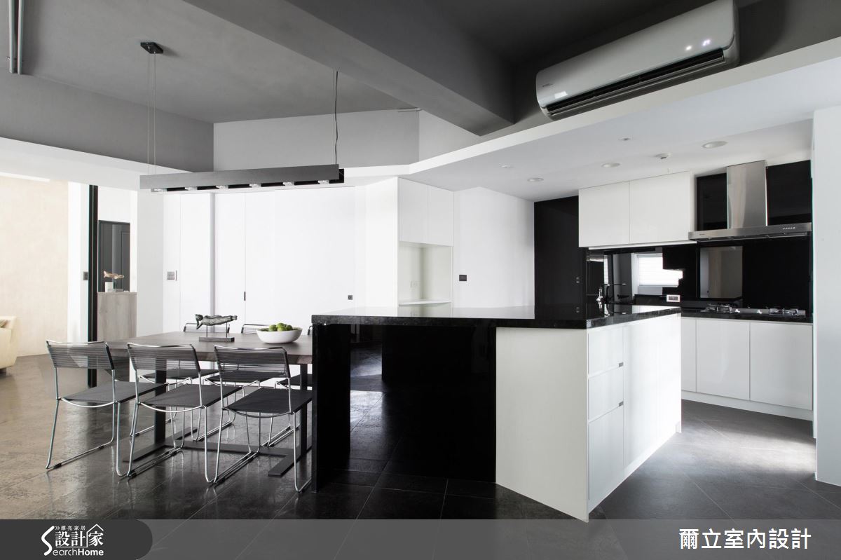 由於居住人口單純,設計師首先拆除原先廚房、和室與次臥等多餘牆面,成功援引大量光線進入室內,讓視線不受零碎隔間阻礙,雙倍放大公領域空間。在格局改造方面,設計師在開放餐廚空間讓動線ㄑ字轉彎,讓客、餐廳動線得以緊密串連;另外,用餐空間更利用大面積斜牆結合收納櫃體與拉門,達多元利用機能。設計師調和材質與色調,以大量黑白純色搭配玻璃隔間,營造時尚俐落氣息,讓視覺更顯通透。全室地坪皆以義大利金屬磚搭配鑿面石英磚,順應空間角度混搭拼貼,營造宛如蒙太奇的分鏡效果,設計師以不露痕跡的地分割與重組,為屋主創造嶄新的居住思維。