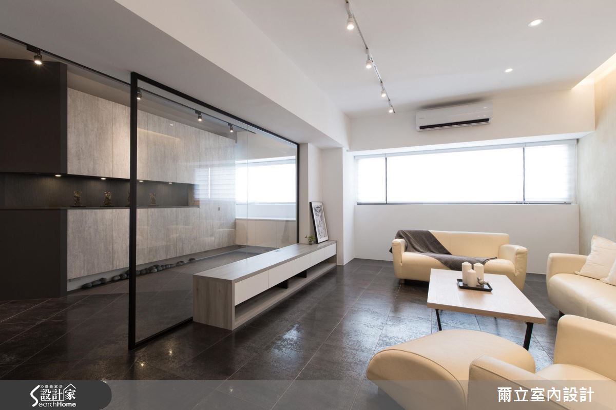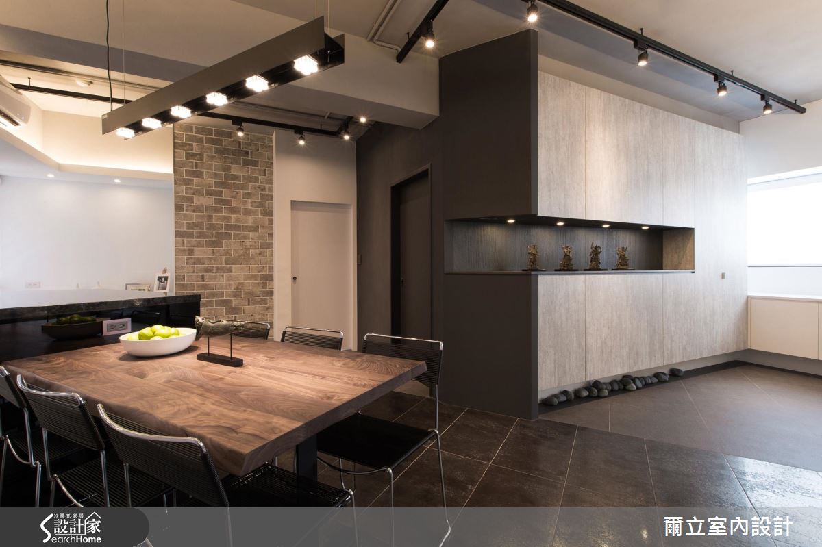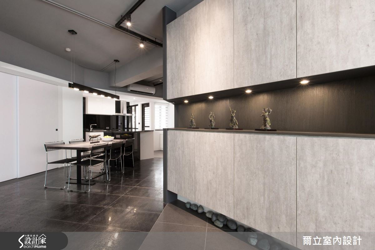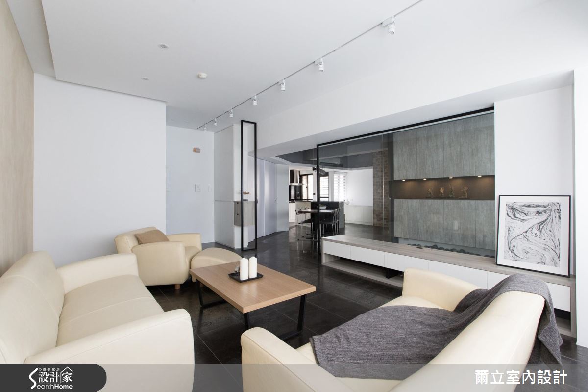 由於居住人口單純,設計師首先拆除原先廚房、和室與次臥等多餘牆面,成功援引大量光線進入室內,讓視線不受零碎隔間阻礙,雙倍放大公領域空間。在格局改造方面,設計師在開放餐廚空間讓動線ㄑ字轉彎,讓客、餐廳動線得以緊密串連;另外,用餐空間更利用大面積斜牆結合收納櫃體與拉門,達多元利用機能。設計師調和材質與色調,以大量黑白純色搭配玻璃隔間,營造時尚俐落氣息,讓視覺更顯通透。全室地坪皆以義大利金屬磚搭配鑿面石英磚,順應空間角度混搭拼貼,營造宛如蒙太奇的分鏡效果,設計師以不露痕跡的地分割與重組,為屋主創造嶄新的居住思維。