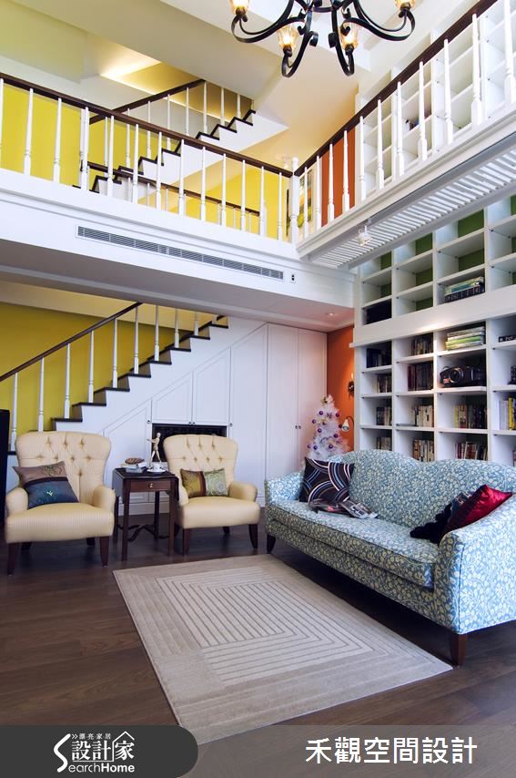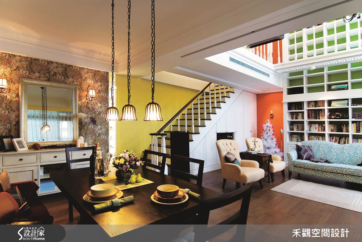 設計團隊利用多彩的繽紛牆面佐以採光優勢,為美式大宅注入清新生機,橫越一、二樓的挑高書牆更成為亮點端景,彰顯屋主夫妻的生活品味。