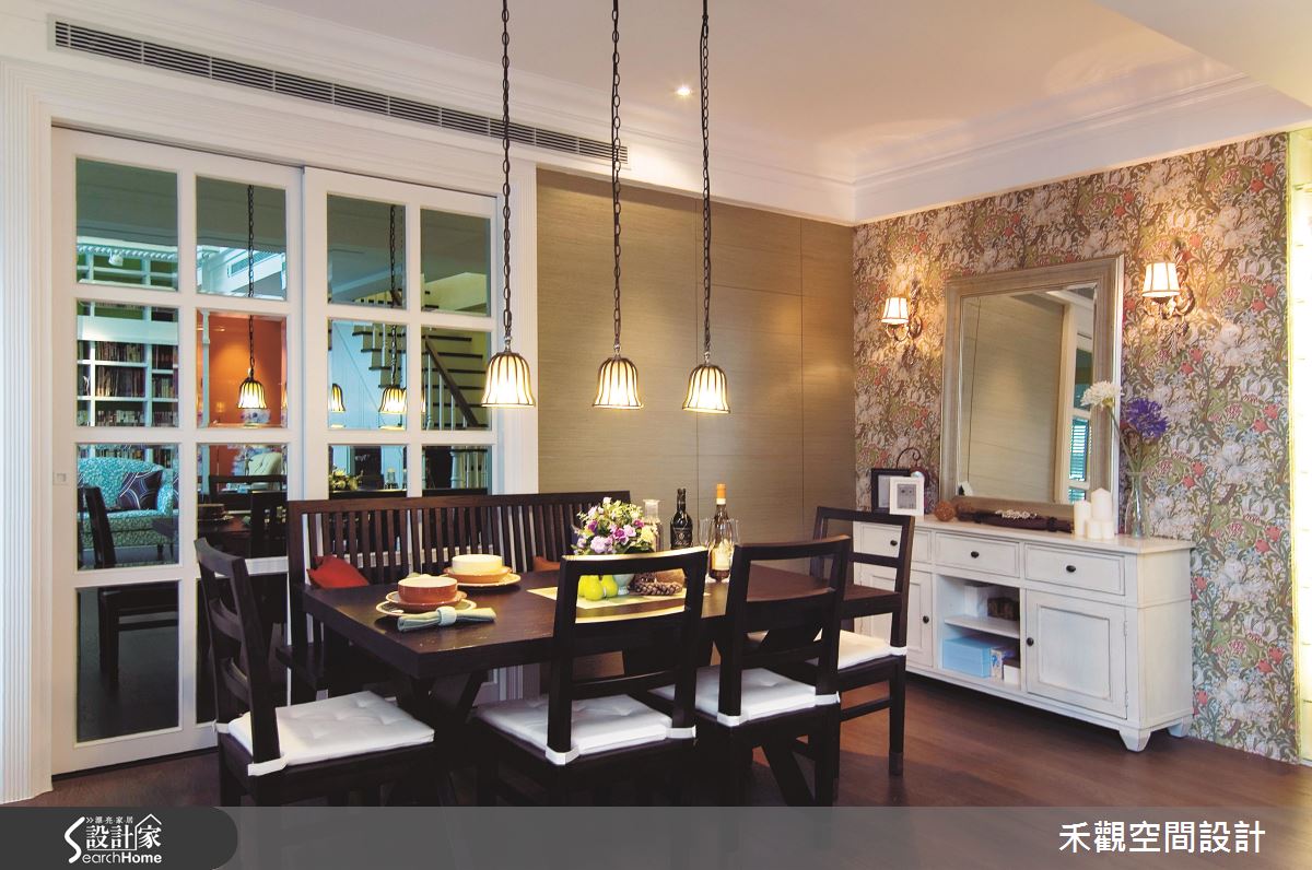 一樓公領域維持挑高 6 米氣勢,並以一座吊燈提純美式大宅氛圍,接著利用繽紛配色創造空間景深與層次,更在無形中打造場域分野。客廳以延伸至二樓的蘋果綠書牆取代背牆,滿足屋主夫妻大量藏書的收納,加上一座爬梯與橘紅、鮮黃的牆面跳色,宛如童話故事場景。餐廳空間則利用經典雕花壁紙與復古餐櫃塑造美式古典氣息,並將獨立廚房隱於格狀玻璃拉門後方,收整並放大視覺感受。設計團隊巧妙將公仔收藏置於樓梯轉折處,成為獨一無二的空間端景。主臥以高貴的葡萄酒紫紅做為主色調,並結合起居空間,打造寬敞、富有隱私的私領域空間。設計團隊將工作空間規畫於頂樓,以復古磚、木樑與藍白色調為設計主調,搭配外部陽台的植栽與南方松木,散發宛如地中海的優閒氣息。