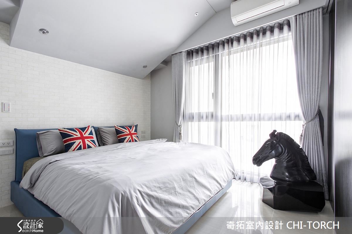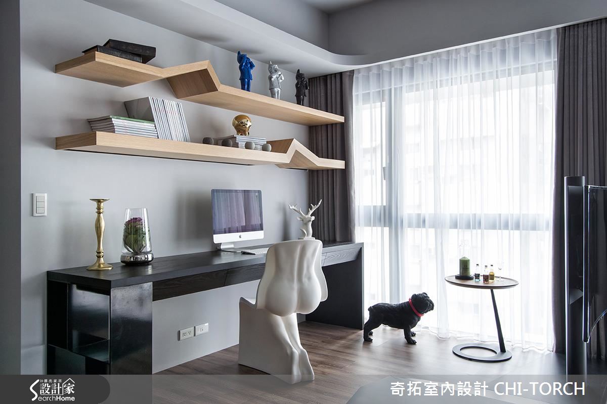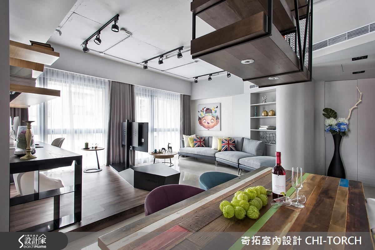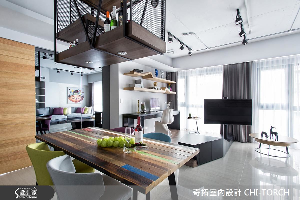 公領域加入全開放式規劃,延展整體寬敞視感,且讓沙發牆面做出巧妙轉折,搭配沙發椅的半弧型陳列方式,型塑延展場域效果,一旁收納櫃則因應角度,得以容納更多儲藏量,並藉由家具、軟件的重點裝飾,不經意混搭出獨具風格的趣味場景;廳區中央規劃旋轉電視牆,使各場域享有絕佳觀賞視角,後方架高地面,打造獨立而開放的書房領域,電視地櫃身兼儲物與座椅功能,讓書房多了起居的主題意義,充滿摩登感的單椅擺設,則畫龍點睛地營造視覺亮點;餐廳區融入燈光與多彩繽紛的家具,並懸吊工業感酒櫃設計,讓屋主得以在家享有美好的品酒時光,一旁以鏡面拉門區分公私領域,在達到界定的同時、也雙倍延伸視覺;寢臥保留採光與窗景優勢,於天花做出傾斜設計,搭上強烈的風格家飾,點燃了個性十足的空間表情!