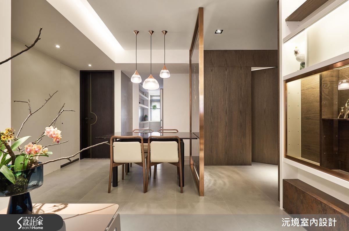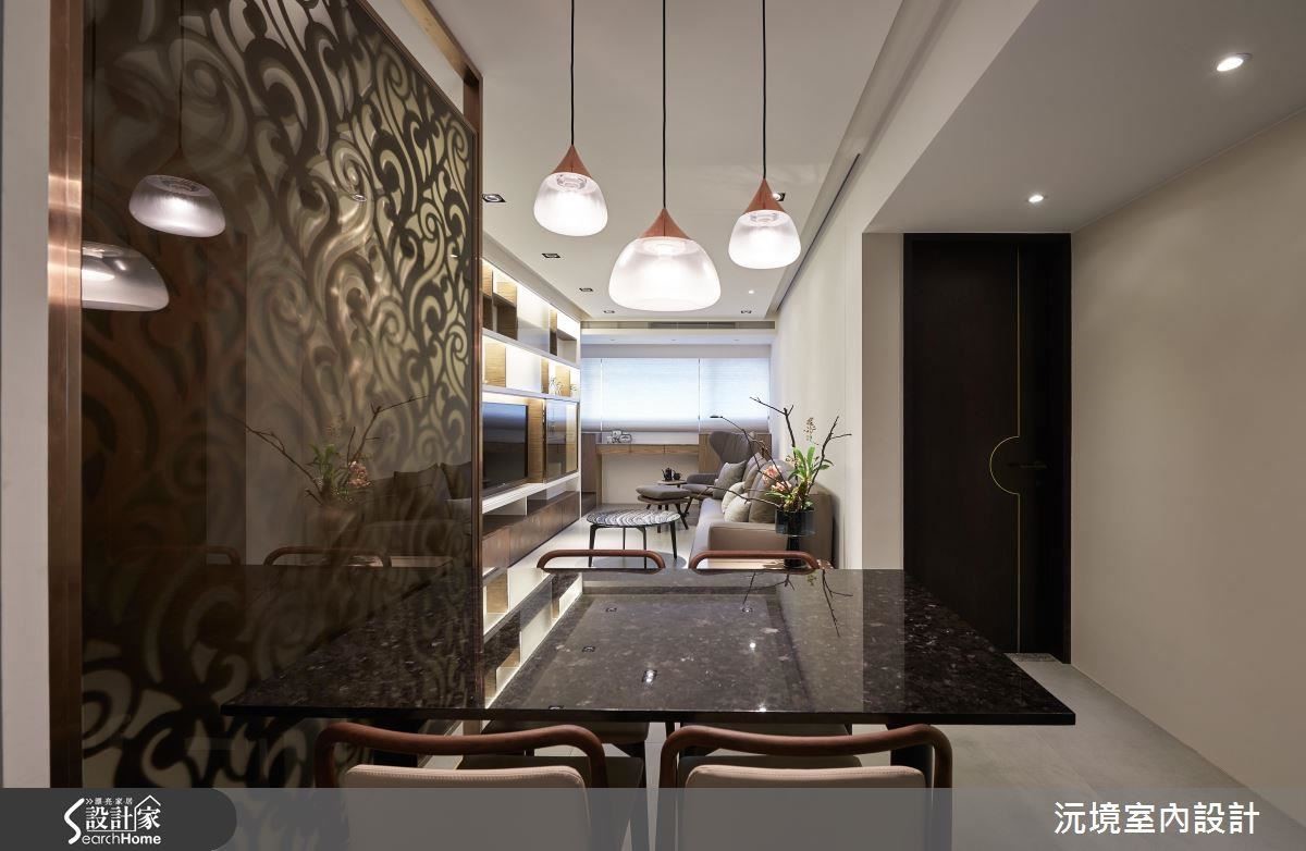 在空間配置上,為放大公共空間的通透性,將原先位於餐桌尾端的木作牆面打掉,改以不鏽鋼鍍鈦與茶玻結合的屏風取代,利用材質的通透性創造視覺的開放感,並將屏風位置移至入口處,設計師表示,適當地作出玄關區隔反而更能放大空間尺度,而屏風上重複性的螺旋家徽圖騰,則成為一入門最搶眼的視覺焦點。