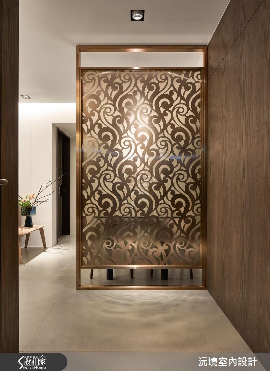 風水方面,利用簡約的半圓金線象徵葫蘆以化解禁忌,並以現代材質與設計揉合屋主想強調的中心思想,取得兩者的最佳平衡,其中,屏風上重複性的螺旋家徽圖騰,更成為一入門最搶眼的視覺焦點。