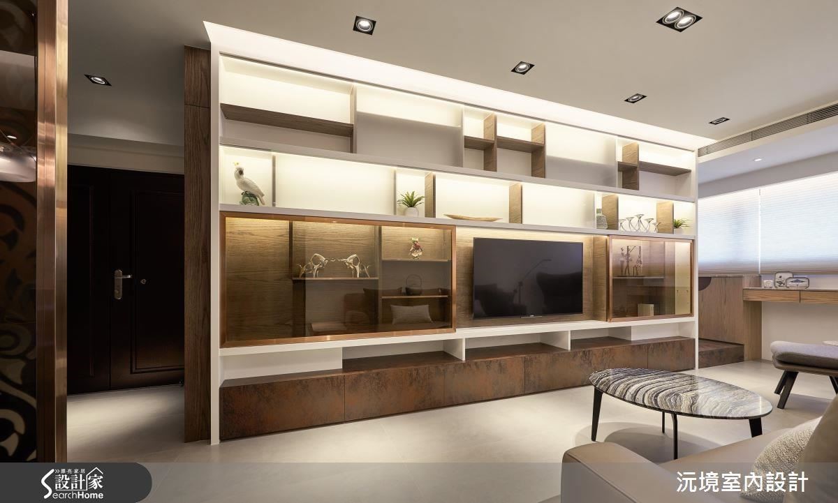 隨著孩子成長,過去較缺乏系統性的收納方式導致生活空間逐漸受到擠壓,3 個成人的生活空間急需改變,三房兩廳的格局雖不致擁擠,但是公共空間與大面積收納空間略顯不足,且客廳南側有一道通往頂樓的樓梯,視覺感受相當突兀,在保留原始格局的前提下,設計師規劃整面置頂的電視兼置物陳設牆,不僅大幅增加收納空間,同時可展示屋主的愛好與收藏,茶玻、實木紋與石英薄板的交錯運用極富層次感,鍍鈦古銅色系的溫潤色澤成熟而穩重,打造出整體的風格主調。