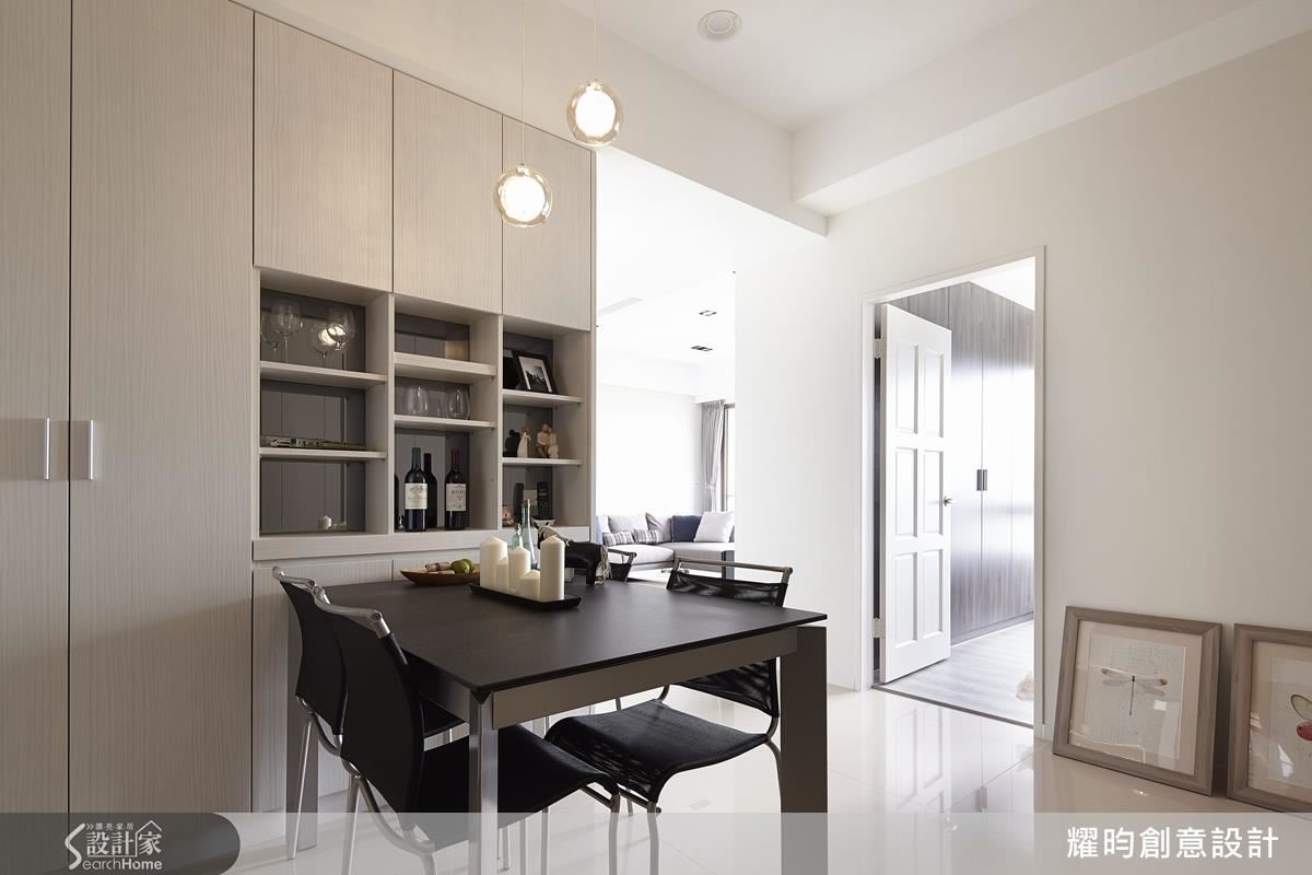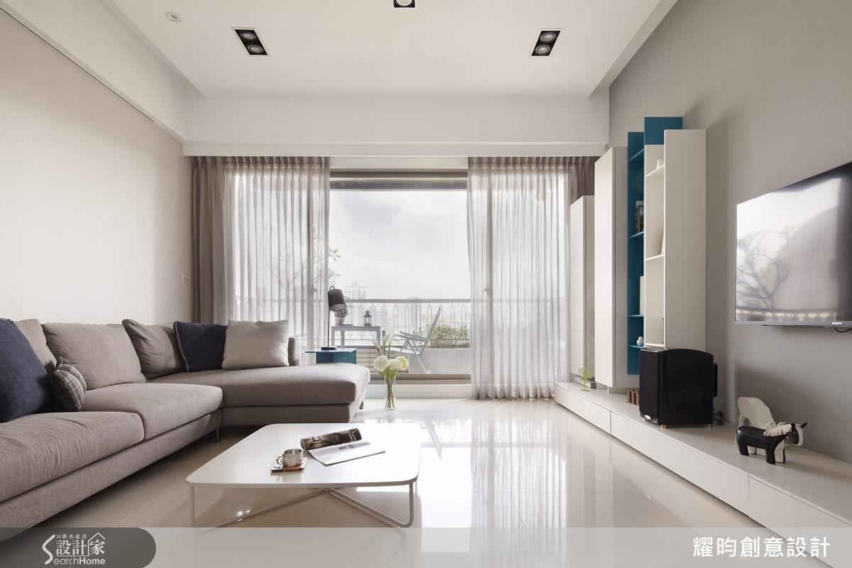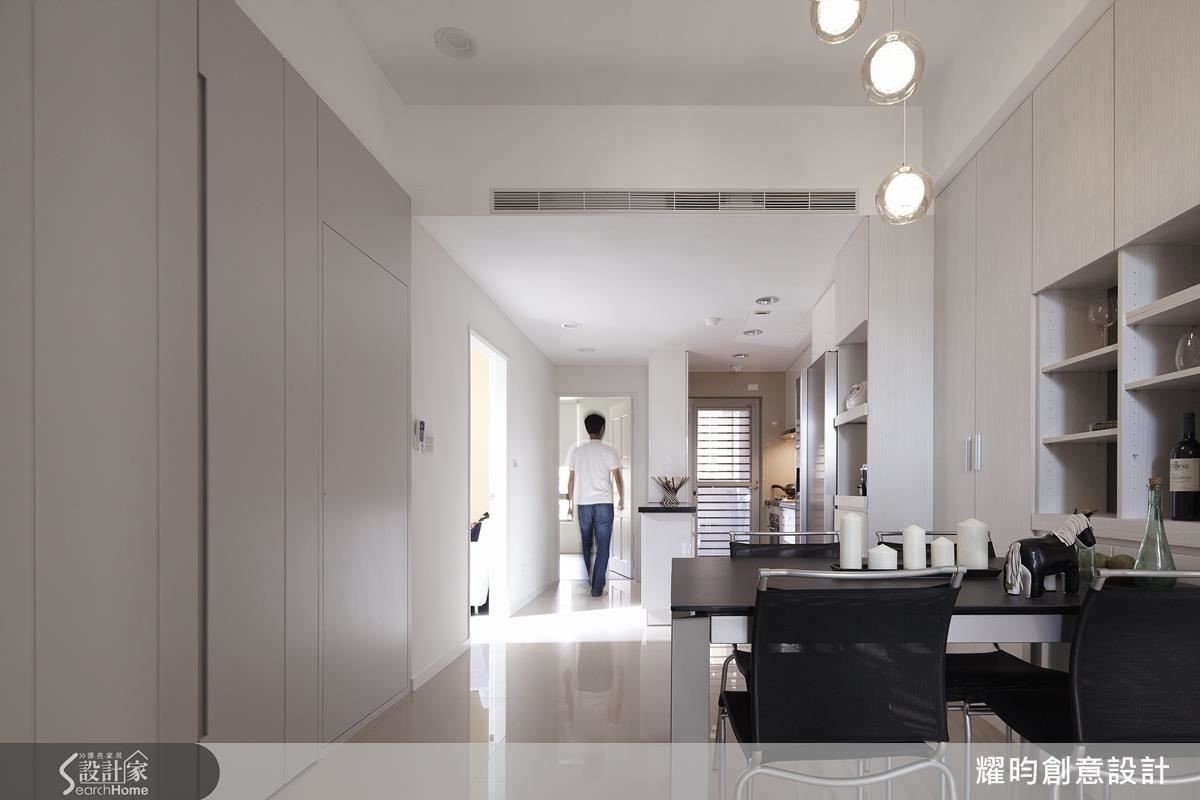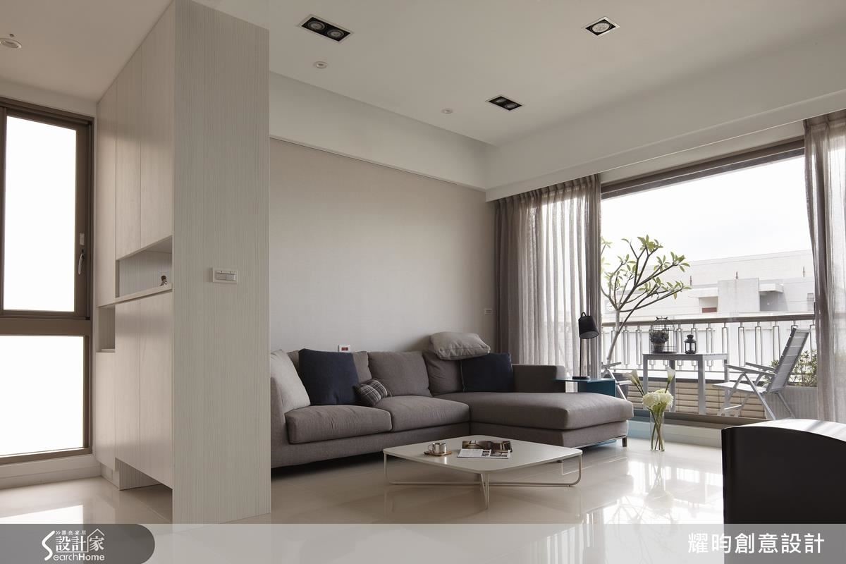 設計師以北歐風格為小夫妻的新婚窩塑造明亮、清爽的基調,玄關屏隔身兼收納凹槽與櫃體,解決容易雜亂的入口問題。客廳以溫潤的藤色系牆面與灰階家具為白色空間提升視覺溫度,接著將天藍色櫃體嵌於白色櫃體間,營造高低錯落的層次感。向內延伸,即是兼具大量收納機能的開放餐廚空間,除了將動線置於同一水平,更以兩側大面積櫃體收整視覺,型塑俐落潔淨的線條,並達成空間放大目標。設計師為主臥安排優良採光,並設置大容量衣櫃,滿足雙倍的收納需求。