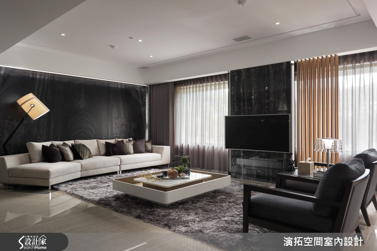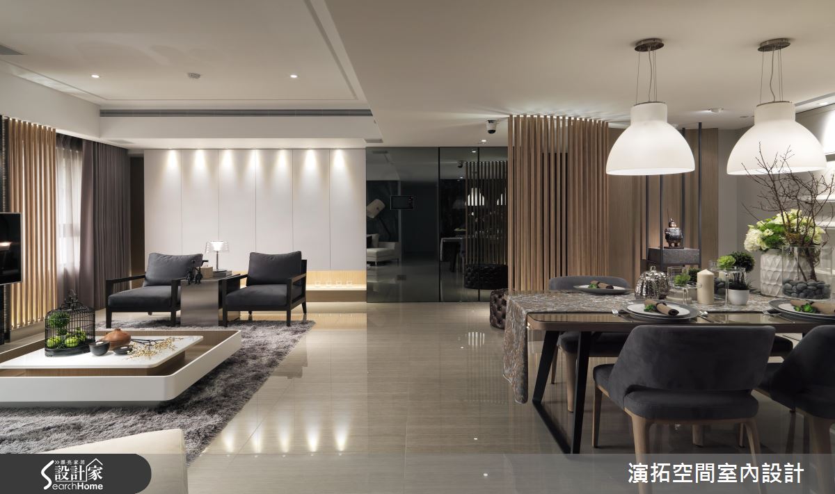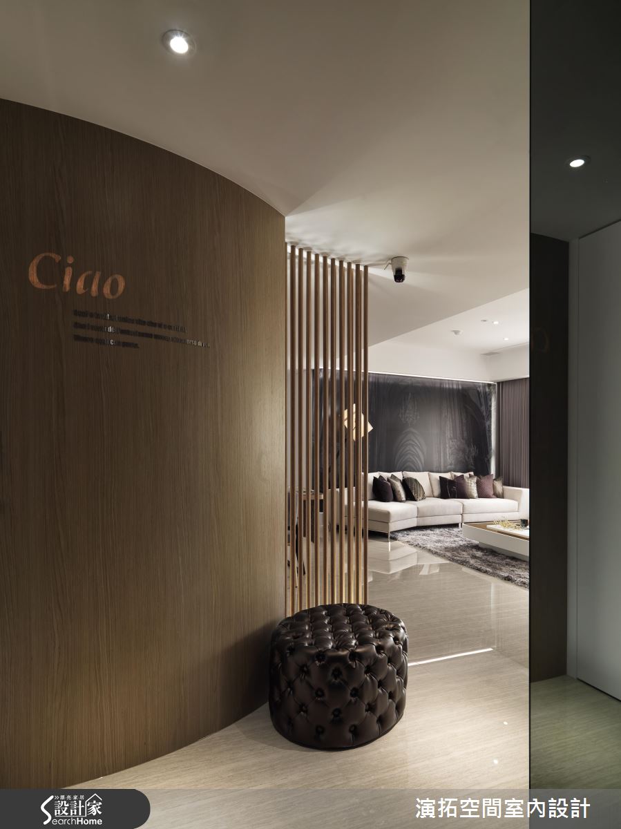 設計師多以現代簡約且俐落的材質,混搭出呈現出有如入住五星級飯店的生活氛圍。一進家門,玄關木質隔屏上浪漫地寫上「Ciao」彷彿歡迎你回家來度假;公領域地板如珍珠絲綢光亮的大理石與深灰系家具、地毯黑色鏡面相映襯出具高質感的空間氣息。客廳電視牆為大片開窗與黑色大理石作包覆,而沙發背牆則覆上歐洲古典建築的壁紙,呈現細膩優雅的美感。餐廳牆面延伸黑色大理石的高雅氣息,搭配上造型俐落大方的餐桌椅與燈飾,展現屋主的大器,設計師透過白色推門設計,將收納櫃體與家電器具隱藏的完美無缺。臥室則多採用木質語彙做鋪陳,並於床頭後方以石材為地坪材質,加高後成為衛浴空間與更衣的專屬空間,同時規劃出擁有長型鏡面的頂級梳妝空間,完整滿足屋主入住飯店風居宅的夢想。