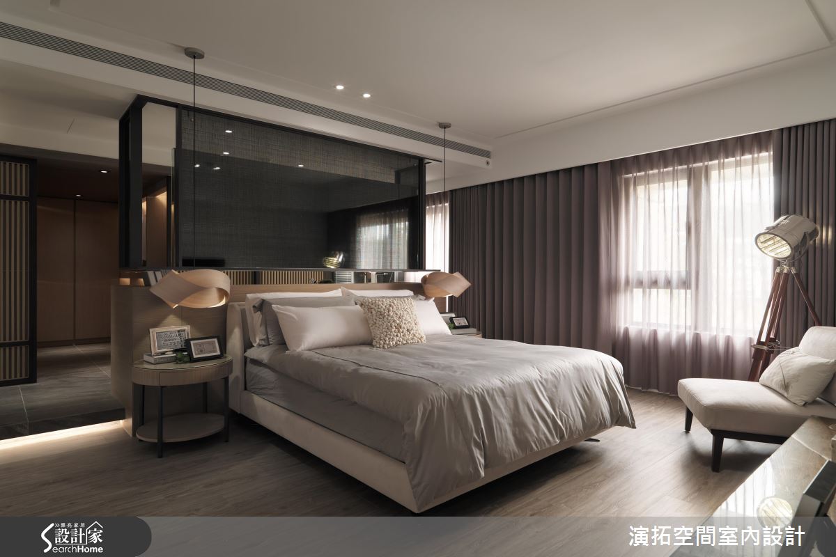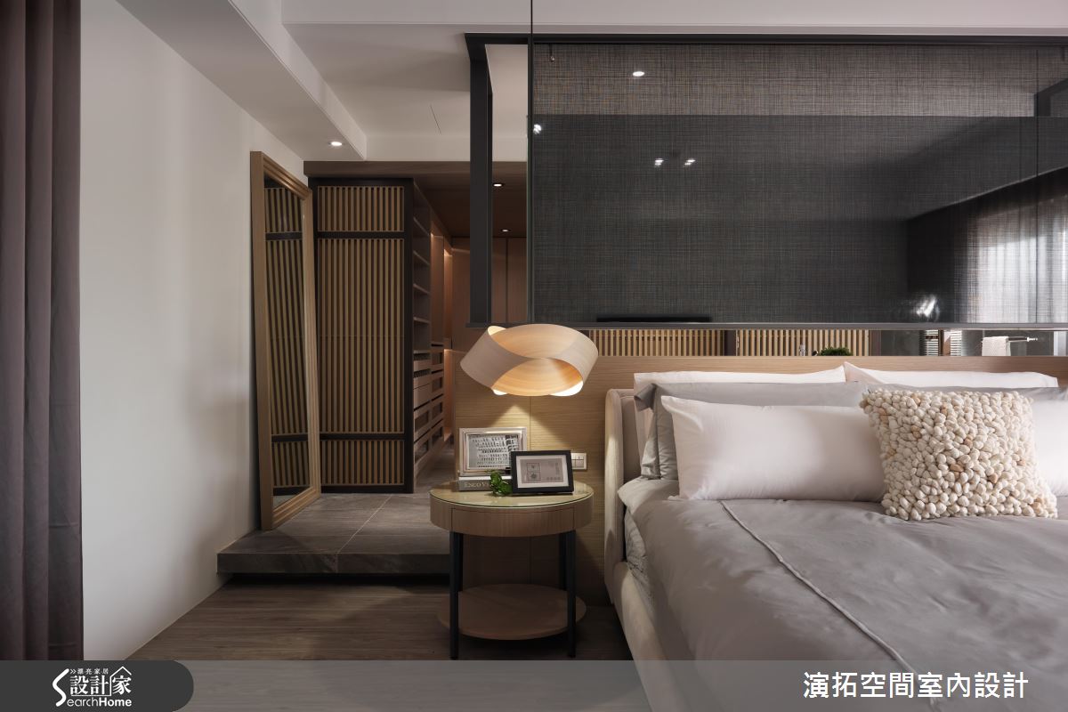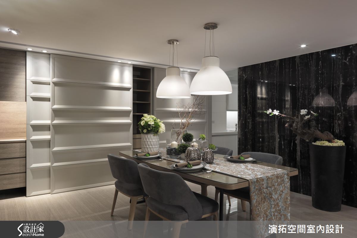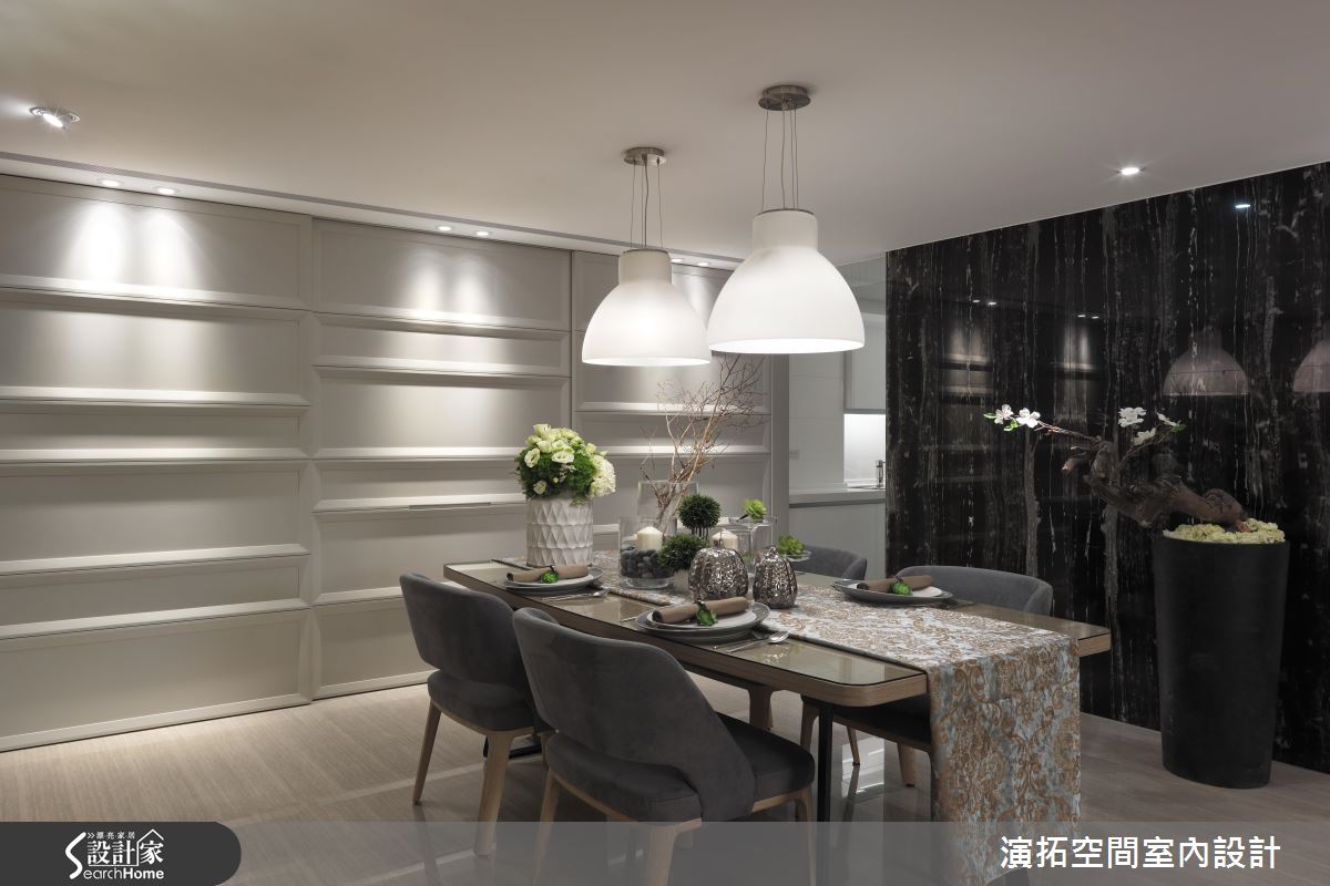 設計師多以現代簡約且俐落的材質,混搭出呈現出有如入住五星級飯店的生活氛圍。一進家門,玄關木質隔屏上浪漫地寫上「Ciao」彷彿歡迎你回家來度假;公領域地板如珍珠絲綢光亮的大理石與深灰系家具、地毯黑色鏡面相映襯出具高質感的空間氣息。客廳電視牆為大片開窗與黑色大理石作包覆,而沙發背牆則覆上歐洲古典建築的壁紙,呈現細膩優雅的美感。餐廳牆面延伸黑色大理石的高雅氣息,搭配上造型俐落大方的餐桌椅與燈飾,展現屋主的大器,設計師透過白色推門設計,將收納櫃體與家電器具隱藏的完美無缺。臥室則多採用木質語彙做鋪陳,並於床頭後方以石材為地坪材質,加高後成為衛浴空間與更衣的專屬空間,同時規劃出擁有長型鏡面的頂級梳妝空間,完整滿足屋主入住飯店風居宅的夢想。