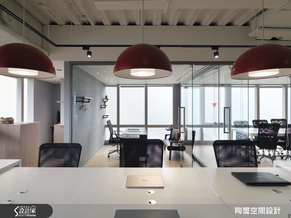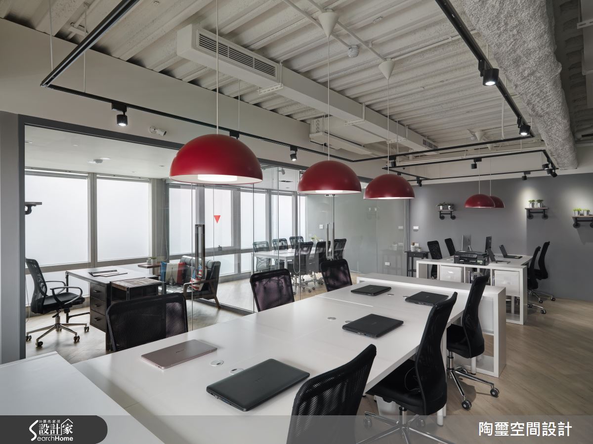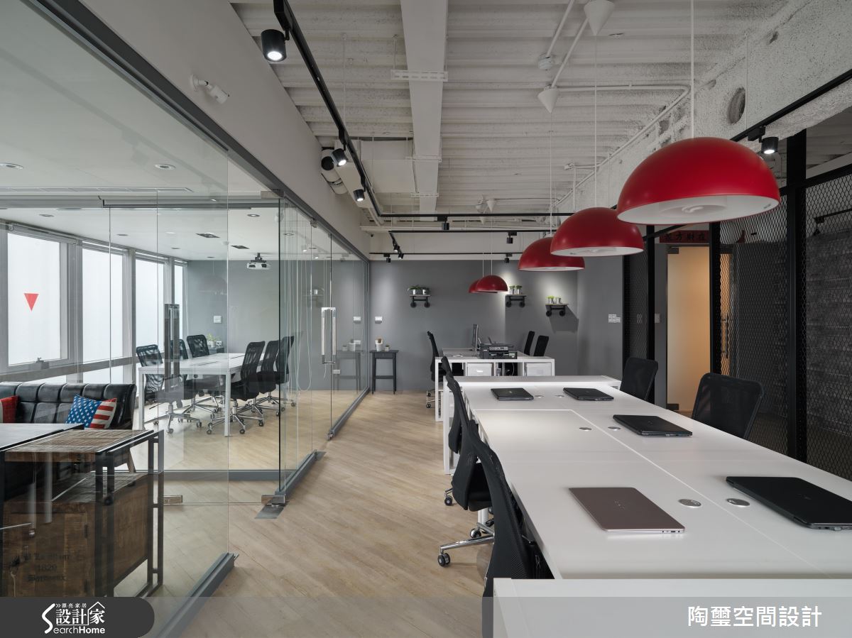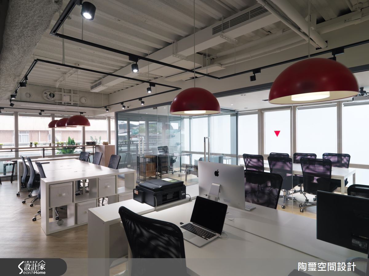 辦公桌上方懸吊紅色吊燈,在極簡主調中攏聚視覺焦點,帶出活力感十足的新潮特色!