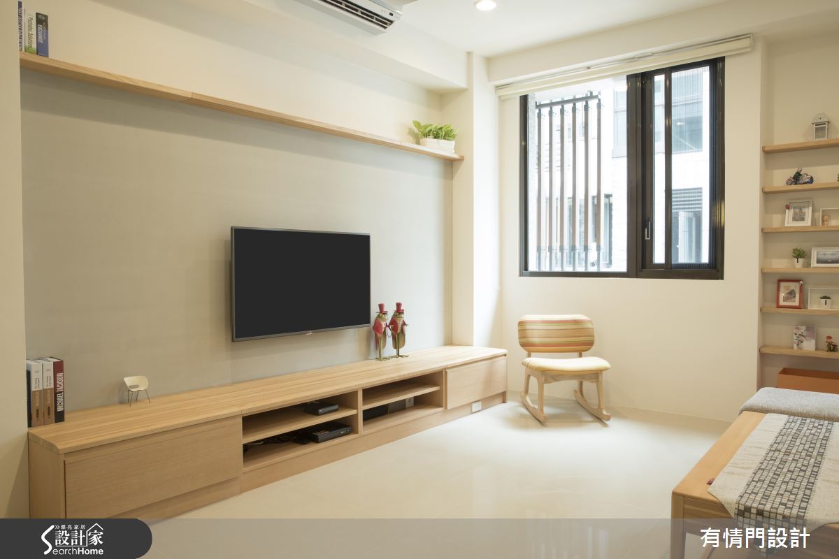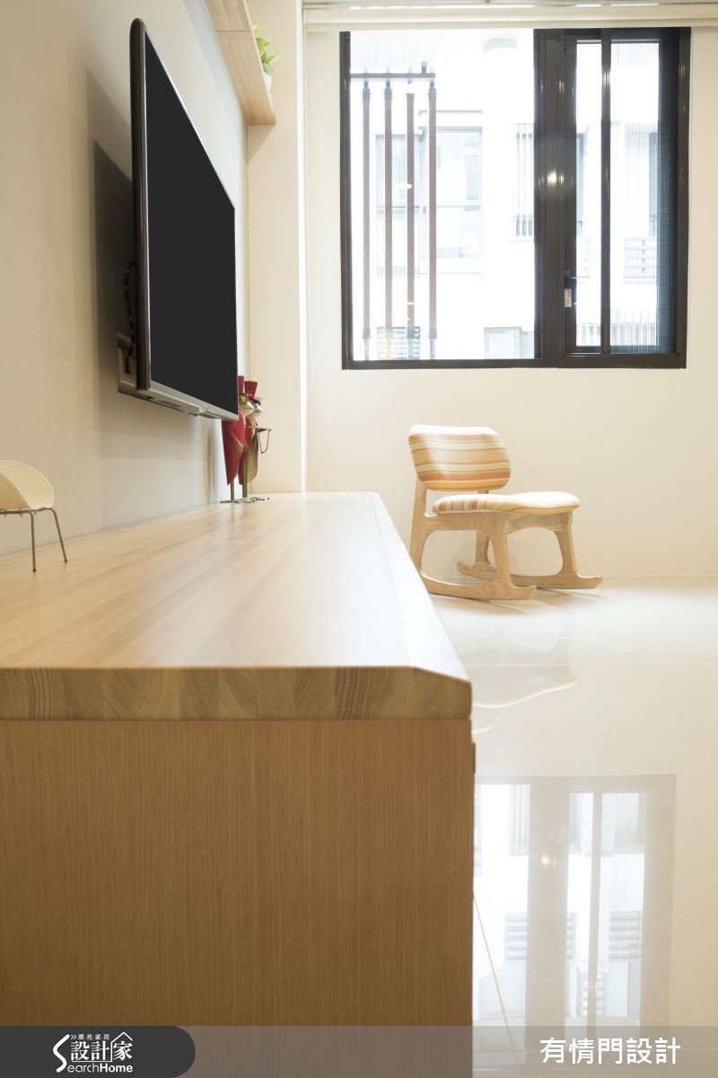 廳區透過純白與木紋,呈現舒服乾淨的視覺基調,讓紋理流動於空間裡,從沙發細節到層板至櫃體、餐桌,使每個生活節奏都與木紋貼近,且藉著自然光的展延,讓室內明亮,剛好中和電視主牆灰泥冷調的空間溫度,予人舒適宜人、宛如春天般的氣息,客廳的側牆柱則規劃梣木實木層板,增加廳區展示空間,一方面也讓業主可置放相框等平日生活點滴;餐廚間則具備開闊的空間感,並化解風水疑慮,於餐廳、廚房中間設計砌岩櫃體遮擋冰箱,在風水中達到納財守財作用,旁邊再增加一座狀垣櫃,提共餐桌區域一個中繼平檯,讓餐廳視覺可與廚房做出延伸;主臥室揮灑清爽藍調,營造涼爽氛圍,並在靠窗處規劃一區閱讀角落,與窗外風景相伴,開啟慵懶悠閒的日常時光。
