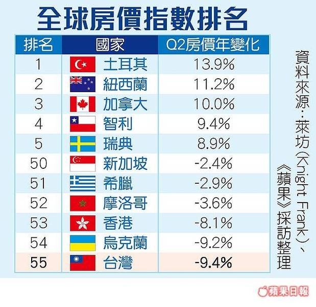 國際不動產顧問公司萊坊(Knight Frank)發布今年Q2全球房價指數報告,台灣今年Q2房價比去年同期跌了9.4%,為調查的55國房市最冷的國家。報告認為,市場受到經濟成長減弱、加上嚴格的打房措施及美元升值等因素,持續影響銷售狀況。