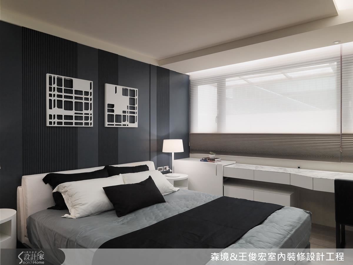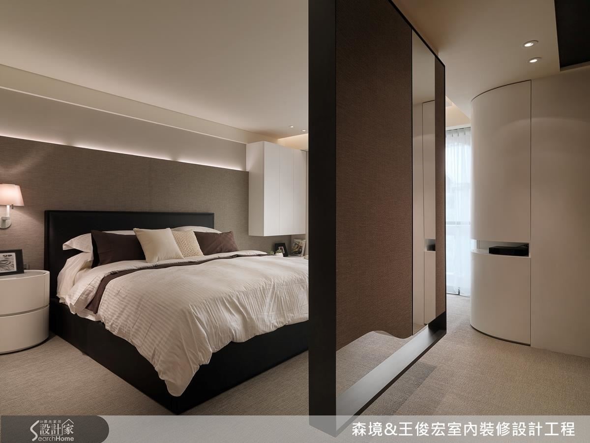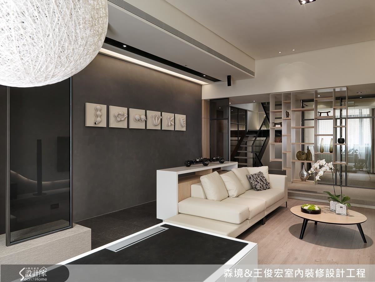 原本大而無當的一樓,利用具有茶水櫃機能的厚實隔間牆,區劃洽談區,既兼顧隱私,也滿足空間區隔與茶水間的實用性;在無隔間的臥房,利用懸吊式造型隔間結合穿衣鏡,滿足複合機能;或用穿透的層架,作為空間界定,既減輕壓迫感,也兼具收納、展示機能。