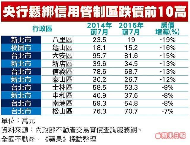 跌幅最深的新北市八里區,在去年8月就已先鬆綁管制,今年前7月均價為19萬元,仍比2014年同期的23.5萬元,下跌19%,當地房仲指出,主因今年釋出多為中古屋,拉低房價。加稅手段應更緩和