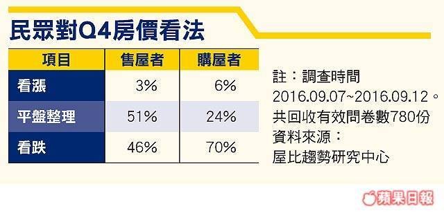 屋比趨勢研究中心以問卷方式調查,房屋買賣雙方對Q4房價看法,共回收有效問卷780份,結果顯示,認為房價會漲的屋主比率僅剩3%、認為平盤整理者51%、看跌46%;買方看漲比率6%、平盤整理24%、看跌則高達70%。
