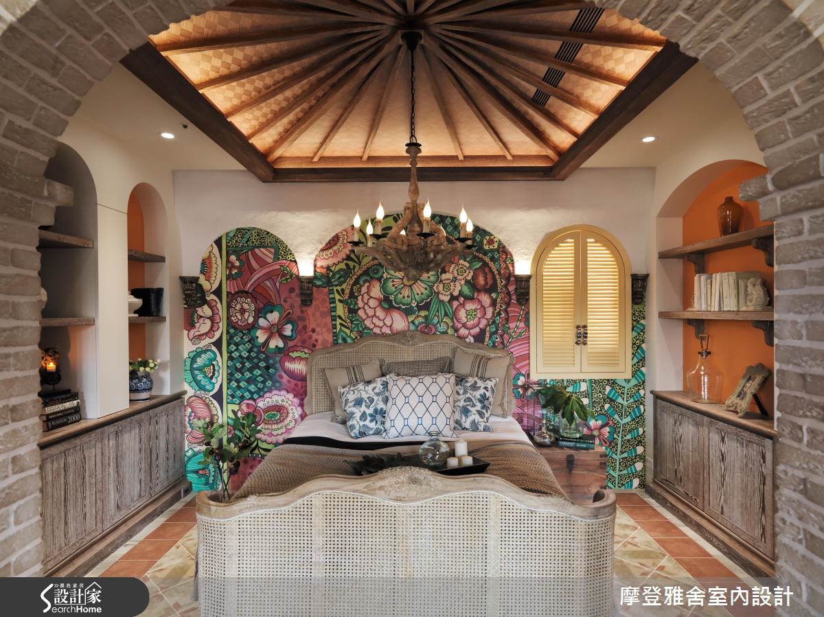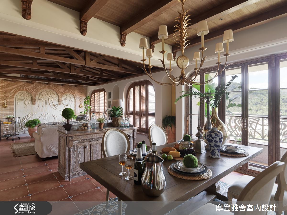 從玄關入門處開始,即以手繪隔屏做出動線導引,引領人進入夢想世界,並將木造材質結合既有建物門片,營造與世隔絕的古堡風格;餐廳藉由大面窗連結陽台,讓視野可延伸至戶外景色,於天花加入金屬餐燈,牆面施以仿壁爐造型,搭配延伸開放的格局視野,建構大器工整的端景畫面;客廳、餐廳之間以家具簡單區劃,同時保有場域之間的交流對話,窗面一貫地延續圓弧語彙,並配置木百葉創造紓壓氣息與調節採光,客廳盡頭則大膽規劃一整面泥造牆面,搭配燈光投射型塑立體視覺,構成活靈活現的古典壁畫,且在牆面融合展示櫃體,內部暗藏儲物空間,開啟機能的趣味表現形式;起居書房內藉由挑高斜木屋頂設計,挹注峇里島度假風韻,將手繪油畫的繽紛花樣揮灑於牆,帶來度假感十足的南洋風情!